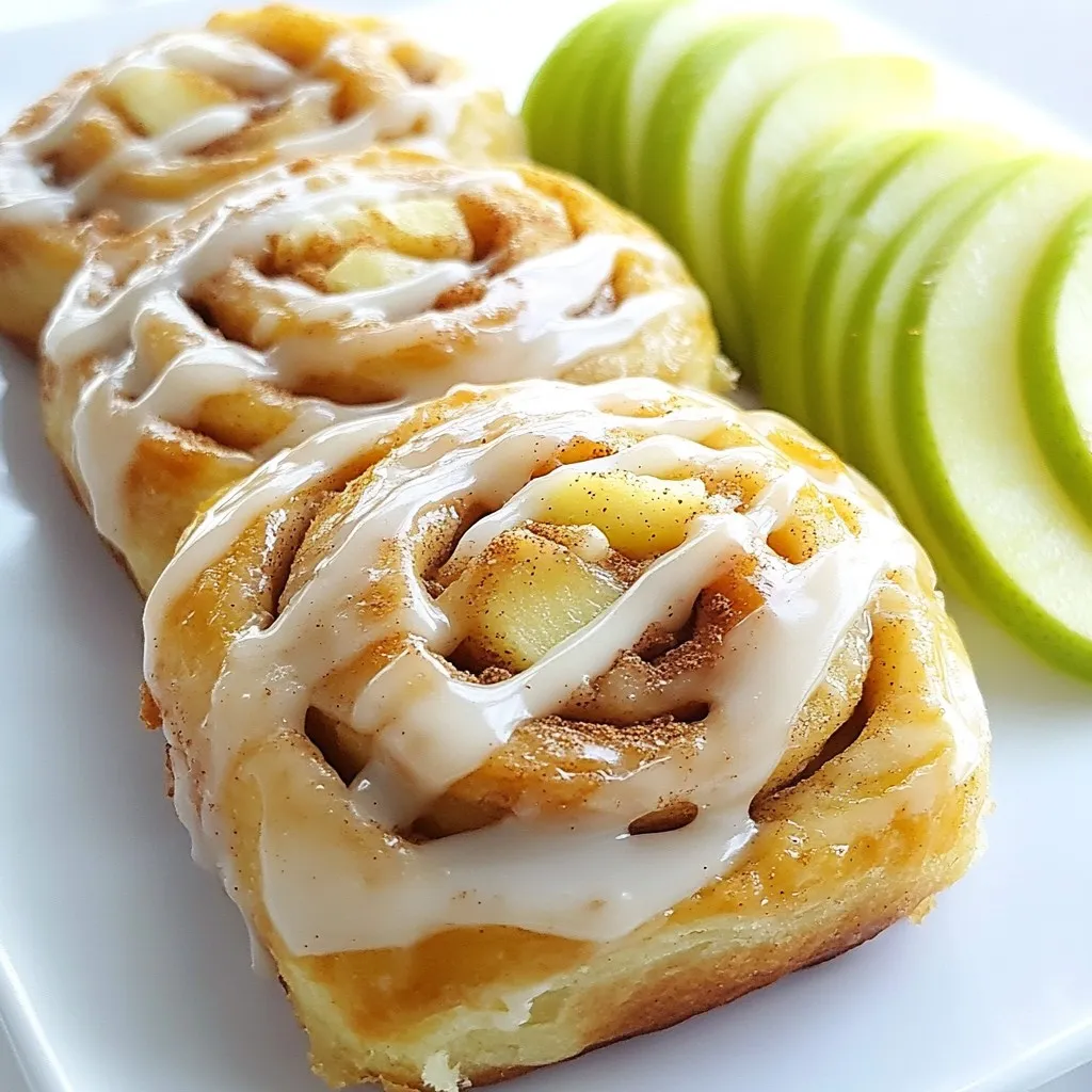 For these tasty apple cinnamon rolls, you need: - 2 cups all-purpose flour - 1/2 cup granulated sugar - 1/2 teaspoon salt - 1 tablespoon baking powder - 1/2 teaspoon baking soda - 1/4 cup unsalted butter, softened - 3/4 cup buttermilk - 1 cup apples, peeled and chopped - 2 teaspoons ground cinnamon - 1/4 teaspoon freshly grated nutmeg - 1/4 cup packed brown sugar - 1 cup powdered sugar (for glaze) - 2 tablespoons milk (for glaze) These ingredients work together to create soft, fluffy rolls with a sweet, spiced flavor. To make your rolls even better, consider adding: - A pinch of vanilla extract - Chopped nuts like walnuts or pecans - Raisins for extra sweetness Adding these extras can bring new textures and tastes to your rolls. You might not have all the ingredients on hand. Here are some swaps: - Use whole wheat flour instead of all-purpose for a nuttier flavor. - Milk can replace buttermilk; just add a splash of vinegar for tang. - Substitute any tart apple, like Honeycrisp, for Granny Smith. These substitutions help you adapt the recipe to what you have, without losing flavor. {{ingredient_image_2}} To start, preheat your oven to 375°F (190°C). Grease a 9-inch round baking pan with butter or non-stick spray. This helps the rolls come out easily later. In a large bowl, whisk together the flour, sugar, salt, baking powder, and baking soda. This step is key for even rising. Next, add the softened butter into the dry mix. Use a fork or pastry cutter to blend it until the mix looks like coarse crumbs. Pour in the buttermilk and mix it until a soft dough forms. Now, take the dough and place it on a lightly floured surface. Knead it gently for about 1 minute. You want it smooth, but don't overdo it. Over-kneading can make your rolls tough. After that, roll the dough into a rectangle that is about 12x8 inches and 1/4 inch thick. If it sticks, just add a bit more flour to your surface. In a small bowl, mix together the brown sugar, ground cinnamon, and freshly grated nutmeg. This mixture will give your rolls a warm, spicy flavor. Once mixed, evenly sprinkle this mixture over the dough. Now, take your chopped apples and spread them on top of the sugar mix. Make sure they are spread out well. This way, every bite has that sweet apple goodness. Starting from the long edge, carefully roll the dough into a tight log. Use a sharp knife to slice the log into 1-inch thick pieces. You should get about 8 rolls. Place these rolls upright in your greased baking pan. They should fit snugly but not be squished. Cover them with a clean kitchen towel and let them rise in a warm spot for about 30 minutes. You want them to puff up a bit. After they rise, pop the pan in the preheated oven. Bake for 20-25 minutes, or until the tops are golden brown. While they bake, prepare the glaze. In a small bowl, whisk the powdered sugar and milk until smooth. Once the rolls are done, let them cool for about 10 minutes. Then, drizzle the glaze generously over the warm rolls. Enjoy the sweet, warm treat! When making apple cinnamon rolls, avoid over-kneading the dough. This can make the rolls tough. Also, ensure your apples are evenly chopped to prevent uneven cooking. Lastly, don’t rush the rising time. Letting the rolls rise properly leads to lighter, fluffier rolls. To achieve flaky rolls, keep your butter cold before mixing it in. Use a pastry cutter or fork to blend it into the dry ingredients. This creates small pockets of butter that help the rolls rise and get that lovely flaky texture. Roll your dough to the right thickness, about 1/4 inch. This thickness helps create those perfect layers. Keep your rolls soft by covering them with a kitchen towel while they rise. This keeps moisture in. After baking, let them cool slightly before adding the glaze. The glaze adds moisture and a touch of sweetness. Store any leftovers in an airtight container to maintain softness. If possible, reheat them briefly in the oven for the best taste. Pro Tips Use Fresh Apples: For the best flavor and texture, opt for fresh, tart apples like Granny Smith. This adds a delightful zing to your rolls. Don't Over-Knead: When kneading the dough, stop as soon as it becomes smooth. Over-kneading can lead to tough rolls, so be gentle! Let Them Rise: Allow the rolls to rise in a warm spot for the best results. This helps them become fluffy and light after baking. Adjust Glaze Consistency: If your glaze is too thick, add a splash more milk; if it's too thin, mix in a bit more powdered sugar until you reach your desired consistency. {{image_4}} You can easily add nuts or raisins to your apple cinnamon rolls. Chopped walnuts or pecans work great. They add a nice crunch and flavor. If you prefer raisins, use golden or regular ones. Mix them with the apple filling. It gives your rolls new taste and texture. Just use about half a cup of nuts or raisins. This simple change makes your rolls even more delightful. You can also turn these apple cinnamon rolls into pumpkin rolls. Use pumpkin puree in place of some apples. About one cup of pumpkin puree adds a rich flavor. Mix it with the cinnamon and nutmeg for a warm spice blend. The dough can stay the same. Bake as usual, and you will enjoy an autumn treat any time of year! If you need gluten-free options, you can still enjoy these rolls. Use gluten-free all-purpose flour instead of regular flour. Many brands offer good blends that work well in baking. The rest of the ingredients stay the same. Just follow the same steps, and you will have tasty gluten-free apple cinnamon rolls. They will be soft and yummy, just like the original recipe! To store your apple cinnamon rolls, let them cool first. Once cooled, place them in an airtight container. This keeps them fresh for up to three days. If you want to keep them longer, consider freezing. When you're ready to enjoy your rolls again, preheat your oven to 350°F (175°C). Wrap the rolls in foil to keep them moist. Heat for about 10-15 minutes, or until warm. Yo