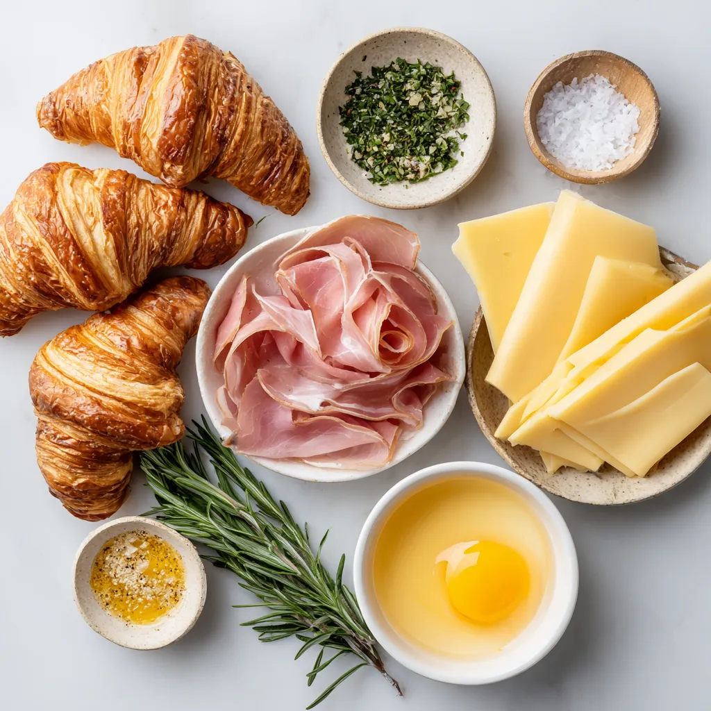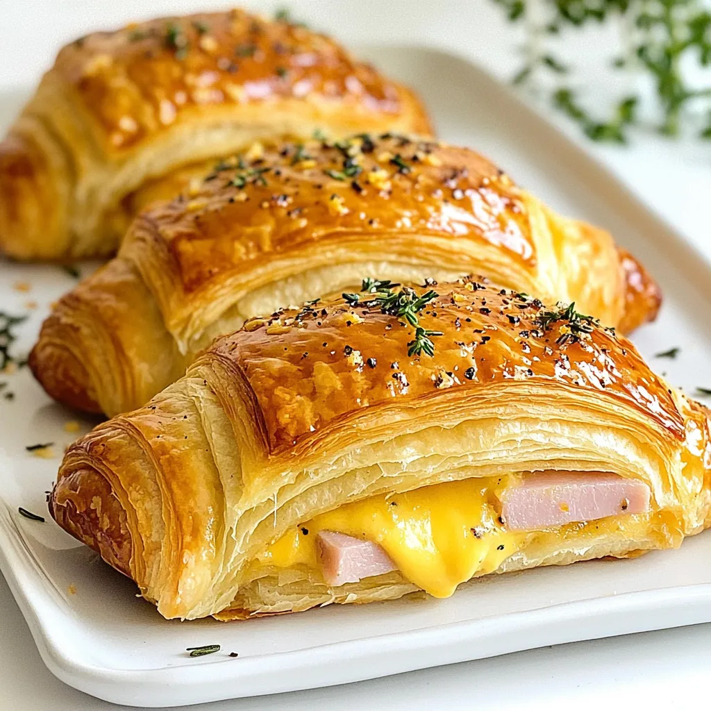 For this recipe, you need 6 large buttery croissants. Fresh croissants work best. Their soft texture holds the filling well. You can find them at bakeries or grocery stores. Frozen croissants can also work if thawed properly. You will need 200g of cooked ham, thinly sliced. I recommend using a good-quality ham for the best flavor. Honey-baked ham adds sweetness, while smoked ham gives a nice depth. Choose what you like best. Thin slices help the ham blend with cheese. Next, use 200g of Swiss cheese, also thinly sliced. Swiss cheese melts beautifully and adds a mild taste. If you want a sharper flavor, try cheddar or Gruyère. Mixing different cheeses can create exciting flavors. Just remember to slice them thinly for easy melting. To boost flavor, add 4 tablespoons of Dijon mustard and 1 tablespoon of fresh rosemary. The mustard adds a tangy kick. Fresh rosemary gives a nice herbal note. Don’t forget salt and freshly cracked black pepper to taste. These simple seasonings enhance the overall taste. {{ingredient_image_2}} Start by preheating your oven to 375°F (190°C). This step is key to getting soft croissants. You want them golden and crisp on the outside. The oven needs to be hot before you bake. Now, let’s put these tasty croissants together. Take each croissant and slice it in half horizontally. This creates a top and bottom. Spread about 1 tablespoon of Dijon mustard on the bottom half. This adds a nice zing. Next, layer the sliced ham on the mustard. Make sure to cover all the mustard for great flavor. After that, add Swiss cheese slices on top of the ham. You want enough cheese to melt and ooze out. It’s all about that cheesy goodness! Sprinkle the finely chopped rosemary over the cheese. Add a pinch of salt and some cracked black pepper. These seasonings really boost the taste. Finally, place the top half back on each croissant. Your sandwiches are now ready to bake! Before baking, brush the tops of the croissants with melted butter. This gives them a nice, shiny look. Place the croissants on a baking sheet lined with parchment paper. This helps with cleanup and keeps them from sticking. Now, brush the tops with the beaten egg for a glossy finish. Bake them in the oven for 12-15 minutes. Watch as they turn golden brown and the cheese melts. Once done, take them out and let them cool for a few minutes. This keeps you from burning your mouth. Serve them warm, and enjoy your cheesy ham delight! To get the perfect texture, use fresh croissants. They should be soft yet flaky. When you bake them, they will become golden and crispy on the outside. Brush the tops with melted butter before baking. This step adds a nice shine and crunch. Bake them until they are golden brown. This usually takes about 12 to 15 minutes. For extra flavor, use Dijon mustard on the bottom half of the croissant. This mustard gives a nice tang. You can also add fresh rosemary. This herb adds a wonderful aroma and depth to your dish. If you want more flavor, try adding some freshly cracked black pepper. Each bite will taste even better. When serving, presentation matters! Place the croissants on a wooden board. Line it with parchment paper for a rustic feel. You can also add a small bowl of extra Dijon mustard on the side. This makes it easy for guests to dip their croissants. Arrange them neatly for a beautiful display. A well-presented dish makes everything more inviting! Pro Tips Use Fresh Croissants: For the best flavor and texture, use fresh, high-quality buttery croissants. They will provide a delightful flaky base for your filling. Customize Your Fillings: Feel free to experiment with different types of cheeses or add ingredients like sautéed onions or spinach for a unique twist on the classic recipe. Perfect Egg Wash: For an extra glossy finish, ensure your egg wash is well-mixed and applied evenly to the tops of the croissants before baking. Serving Suggestions: Pair your croissants with a light salad or fresh fruit for a well-rounded meal, making it perfect for brunch or a light lunch. {{image_4}} You can switch up the meats in these croissants. Instead of ham, try turkey or chicken. Both options add a nice twist. If you prefer something richer, use prosciutto or salami. These meats bring unique flavors. You can even use a meat substitute, like tofu or tempeh, for a vegetarian version. The cheese can change the whole taste. Swiss cheese is great, but don't stop there! Gouda or cheddar can add a sharp flavor. For a creamier touch, try brie or cream cheese. Mix and match cheeses for a fun flavor experience. You can also use a spicy cheese if you want some heat. Dijon mustard is classic, but you can explore other spreads. Try a spicy mustard for a kick. Honey mustard adds sweetness. You can even use pesto for a fresh touch. A layer of mayo or aioli can also work well. Each spread brings its own charm to the croissant. After enjoying your croissants, store any leftovers in an airtight container. This keeps them fresh. Place the croissants in the fridge if you plan to eat them within three days. If you want to keep them longer, freezing is a better choice. To reheat your croissants, preheat your oven to 350°F (175°C). Place the croissants on a baking sheet. Heat for about 10 minutes until warm. This method helps keep the croissants crispy. You can also use a microwave, but this may make them soft. Freezing is a great option if you have extra croissants. Wrap each croissant tightly in plastic wrap. Then, place them in a freezer bag. They can last for up to three months. To enjoy, just thaw them in the fridge overnight before reheating. Yes, you can use thawed croissants. Just make sure they are fully thawed before starting. This helps them bake evenly. Thawed croissants can still taste great. They may not be as flaky but will still be yummy. If you don’t have Dijon mustard, use yellow mustard. You can also try honey mustard for a sweet twist. Both options add a nice flavor to your croissants. Adju