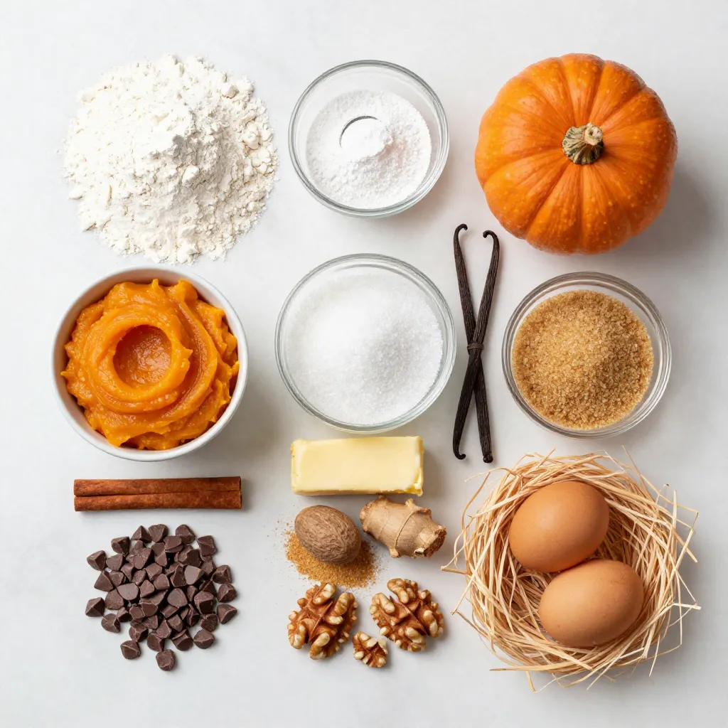 - 1 ¾ cups all-purpose flour - 1 teaspoon baking soda - ½ teaspoon baking powder - ½ teaspoon salt - 1 teaspoon ground cinnamon - ½ teaspoon ground nutmeg - ½ teaspoon ground ginger - ½ cup unsalted butter, softened - 1 cup granulated sugar - ½ cup light brown sugar, packed - 2 large eggs, at room temperature - 1 cup canned pure pumpkin puree - 1 teaspoon pure vanilla extract - 1 cup chocolate chips (milk or dark) - ½ cup chopped walnuts (optional) If you need to convert measurements, here are some simple tips: - 1 cup = 240 milliliters - ½ cup = 120 milliliters - 1 teaspoon = 5 milliliters - 1 tablespoon = 15 milliliters Using these conversions can help if you lack measuring tools. If you lack an ingredient, you can make easy swaps: - Use whole wheat flour instead of all-purpose for added fiber. - Substitute coconut oil for unsalted butter for a dairy-free option. - Replace granulated sugar with coconut sugar for a lower glycemic index. - You can skip walnuts if you prefer a nut-free bread. These swaps keep the recipe tasty and fun! {{ingredient_image_2}} Preheat your oven to 350°F (175°C). Grease a 9x5 inch loaf pan. Dust the pan with flour to stop the bread from sticking. This step is key for a smooth removal after baking. In a medium bowl, whisk together these dry ingredients: - 1 ¾ cups all-purpose flour - 1 teaspoon baking soda - ½ teaspoon baking powder - ½ teaspoon salt - 1 teaspoon ground cinnamon - ½ teaspoon ground nutmeg - ½ teaspoon ground ginger Make sure everything is well mixed. This blend adds flavor and helps the bread rise. In a large bowl, cream together: - ½ cup unsalted butter, softened - 1 cup granulated sugar - ½ cup light brown sugar, packed Use an electric mixer for about 3-4 minutes. The mixture should turn light and fluffy. This step adds air to your bread, making it soft. Add two large eggs one by one, mixing well after each. Then, stir in: - 1 cup canned pure pumpkin puree - 1 teaspoon pure vanilla extract Mix until smooth. The pumpkin gives moisture, and the vanilla adds flavor. Now, gently fold the dry mixture into the wet mixture. Use a spatula to combine them well. Be careful not to overmix. This keeps your bread light and fluffy. Next, fold in: - 1 cup chocolate chips - ½ cup chopped walnuts (optional) Make sure to distribute them evenly through the batter. This step adds sweet and crunchy bites. Pour the batter into your prepared loaf pan. Smooth the top with a spatula. Place it in the oven and bake for 60-70 minutes. Check if it’s done by inserting a toothpick into the center. If it comes out clean, it’s ready! After baking, let the bread cool in the pan for about 10 minutes. Then, transfer the bread to a wire rack to cool completely. For a lovely presentation, slice the bread and serve it warm. Add a dusting of powdered sugar or a dollop of whipped cream for extra delight. Enjoy your tasty creation! To make your chocolate chip pumpkin bread moist, use canned pumpkin puree. It adds moisture and flavor. Always use softened butter for better mixing. Cream it with sugars until fluffy. This step adds air, which keeps the bread light. Avoid overmixing when you combine wet and dry ingredients. Overmixing can lead to a dense loaf. Also, let the bread cool in the pan for a bit. This helps keep it moist as it cools. For even baking, preheat your oven correctly. Set it to 350°F (175°C) before you start mixing. Prepare your loaf pan by greasing and flouring it. This prevents sticking and helps the bread rise evenly. Pour the batter into the pan and smooth the top. This way, the bread bakes uniformly. Use a toothpick to check doneness. Insert it into the center; it should come out clean when the bread is ready. To boost flavor, use fresh spices like ground cinnamon, nutmeg, and ginger. Fresh spices pack more punch than old ones. You can also add vanilla extract for a warm aroma. Consider adding chopped walnuts for a nutty crunch. If you love chocolate, use dark chocolate chips. They add a rich taste and contrast to the pumpkin. For a delightful finish, dust your slices with powdered sugar before serving. Pro Tips Use Room Temperature Ingredients: Allow your eggs and butter to come to room temperature before mixing. This helps create a smoother batter and improves the loaf's texture. Don’t Overmix the Batter: When combining wet and dry ingredients, mix just until incorporated. Overmixing can lead to a tough bread, so be gentle! Check for Doneness: Since ovens can vary, start checking your bread a few minutes before the recommended baking time. Insert a toothpick into the center; if it comes out clean, your bread is ready! Storage Tips: To keep your bread moist, wrap it tightly in plastic wrap or store it in an airtight container. It can also be frozen for up to three months! {{image_4}} To make vegan chocolate chip pumpkin bread, swap out the eggs and butter. Use flax eggs instead. Mix 1 tablespoon of ground flaxseed with 2.5 tablespoons of water for each egg. Replace the butter with a neutral oil like canola or melted coconut oil. This keeps the texture soft and moist. Use vegan chocolate chips for a fully plant-based treat. For a gluten-free version, replace the all-purpose flour with a gluten-free blend. Look for blends that include xanthan gum, as this helps mimic the texture of wheat flour. Make sure all other ingredients are gluten-free as well. This way, everyone can enjoy this tasty bread without worry. You can play with flavors in your chocolate chip pumpkin bread. Try adding different spices like allspice or cloves for a unique twist. You can also mix in chopped pecans or almonds for a nutty crunch. For a fun touch, try adding a swirl of cream cheese or nut butter in the batter before baking. To keep your chocolate chip pumpkin bread fresh, store it in an airtight container. This helps maintain its moisture and flavor. You can also wrap it tightly in plastic wrap. Place the wrapped loaf in a cool, dark place. For best taste, en