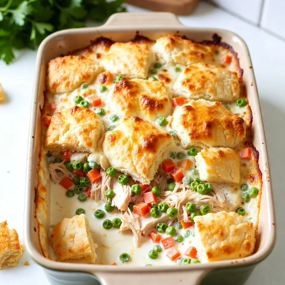 A comforting and hearty casserole featuring shredded chicken, vegetables, and a flaky biscuit topping.