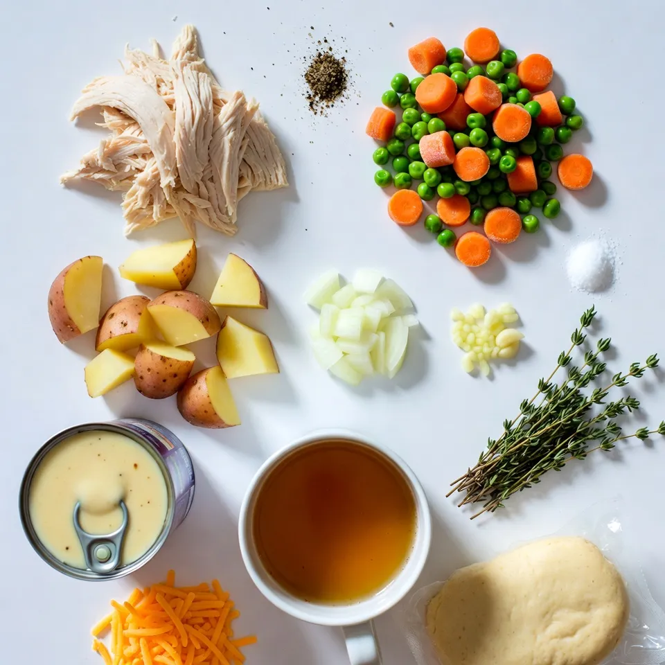 In a large mixing bowl, combine the shredded chicken, frozen peas and carrots, pre-cooked diced potatoes, finely diced onion, and minced garlic. Add the cream of chicken soup, chicken broth, dried thyme, freshly ground black pepper, and fine sea salt. Stir the mixture thoroughly until all ingredients are well incorporated and evenly coated.