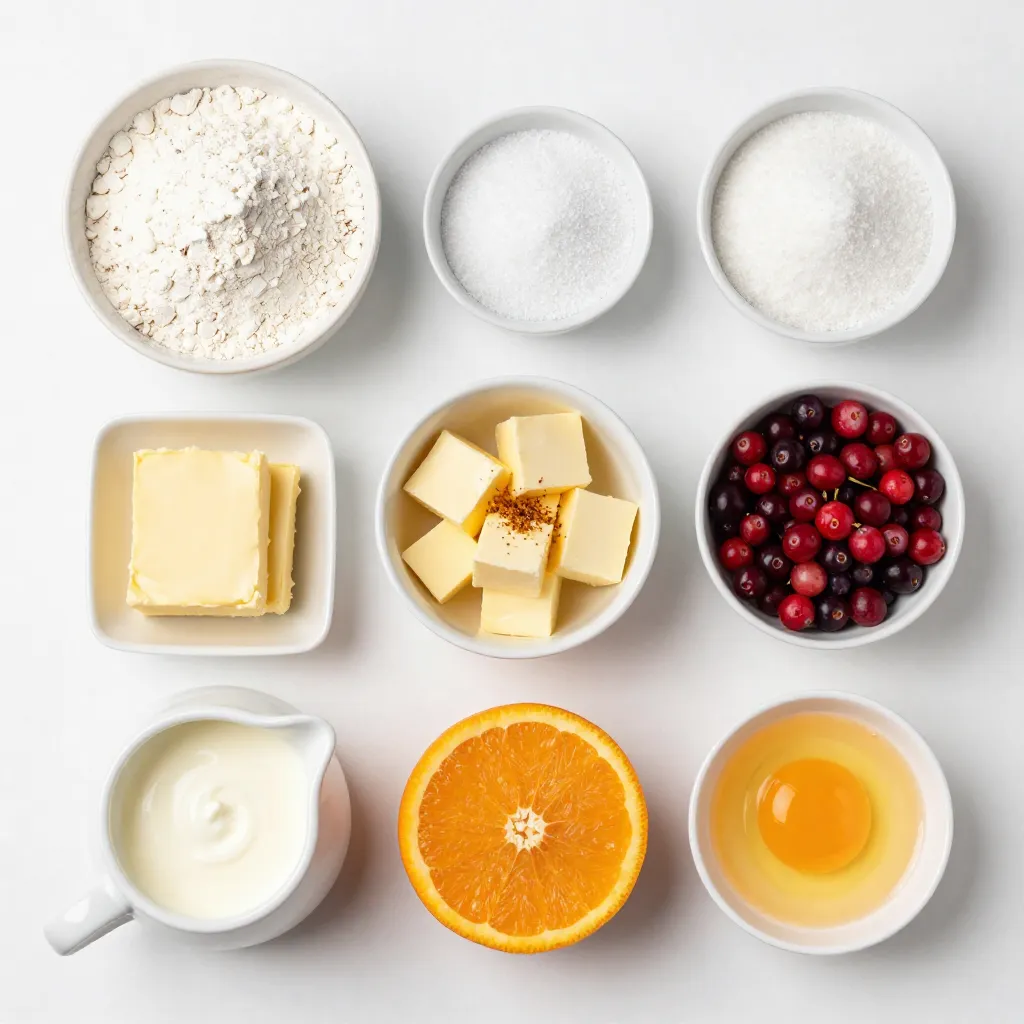 To make these delightful scones, gather the following ingredients: - 2 cups all-purpose flour - 1/2 cup granulated sugar - 1 tablespoon baking powder - 1/2 teaspoon salt - 1/2 cup unsalted butter, cold and cubed - 1 cup fresh or dried cranberries - Zest of 1 large orange - 1/2 cup heavy cream - 1 egg, beaten (for egg wash) These items work together to create a perfect balance of sweet and tart. You can modify some ingredients in this recipe. Here are a few ideas: - Use whole wheat flour for a nuttier flavor. - Substitute brown sugar for a deeper sweetness. - Instead of heavy cream, try buttermilk for a lighter scone. - Use lemon zest if you want a different citrus flavor. These adjustments can add new layers to your scones. Each scone offers a delightful blend of flavors. Here’s a simple breakdown: - Calories: Approximately 200 per scone - Protein: 3 grams - Carbohydrates: 28 grams - Fat: 10 grams - Fiber: 1 gram These scones are a tasty treat, perfect for breakfast or a snack. Enjoy your baking! {{ingredient_image_2}} First, set your oven to 400°F (200°C). This heat makes the scones rise nicely. Next, grab a baking sheet. Line it with parchment paper. This helps the scones not stick. In a large bowl, combine 2 cups of all-purpose flour, 1/2 cup of granulated sugar, 1 tablespoon of baking powder, and 1/2 teaspoon of salt. Use a whisk to mix them well. Make sure there are no lumps left. This mix is the base for our scones. Now, add 1/2 cup of cold, cubed butter to the flour mix. You can use a pastry cutter or your fingers. Mix until the butter looks like small pebbles. Next, fold in 1 cup of cranberries and the zest of 1 large orange. This adds a burst of flavor. Pour in 1/2 cup of heavy cream slowly. Use a spatula to stir until the dough forms. Don’t worry if it looks a bit dry. Turn the dough onto a floured surface. Gently knead it just a few times until it’s smooth. Shape it into a circle about 1-inch thick. Cut it into wedges or use a round cutter for fun shapes. Place the scones on your prepared baking sheet. Leave some space between each one. Brush the tops with a beaten egg for a golden finish. Bake them for 15-20 minutes. They’re done when they are golden-brown and a toothpick comes out clean. After baking, cool them slightly on a wire rack. Enjoy your delicious Cranberry Orange Scones! To make your cranberry orange scones light and flaky, start with cold butter. Cold butter creates pockets of air, making your scones rise. Use a pastry cutter or your fingers to mix. Aim for pea-sized pieces. This helps keep the texture just right. Mixing the dough gently is key. After adding the cream, use a spatula to combine. Stir just until the dough forms. Overmixing can make scones tough. It's okay if some dry bits remain. A few gentle kneads on a floured surface will bring it together. Serve your scones warm for the best taste. Place them on a lovely platter. Dust with powdered sugar for a sweet touch. Add fresh cranberries and orange slices for color. A side of clotted cream or butter makes for a delightful pairing. Enjoy with tea or coffee! Pro Tips Use Cold Butter: Ensure your butter is cold and cubed before mixing it into the dry ingredients. This helps create a flaky texture in the scones. Don’t Overmix: When combining the dough, mix just until it comes together. Overmixing can lead to tough scones. Experiment with Flavors: Feel free to add other ingredients like chocolate chips or nuts to customize your scones to your taste. Serve Warm: For the best flavor and texture, serve the scones warm from the oven, ideally with a spread of butter or cream cheese. {{image_4}} You can use either dried or fresh cranberries in your scones. Fresh cranberries give a bright, tart flavor. They also add moisture, which makes the scones fluffy. Dried cranberries are sweeter and chewier. They can make the scones a bit denser. You can even mix both for a fun texture and flavor combo. While orange zest shines in this recipe, you can try other citrus fruits. Lemon zest adds a fresh, zesty taste. Lime zest gives a more tropical touch. Grapefruit zest can create a unique twist. Each zest brings a new flavor dimension, so feel free to experiment! Nuts and chocolate can elevate your scones. Walnuts or pecans add a crunchy texture and nutty flavor. They pair well with the tart cranberries. Dark chocolate chips add sweetness and richness. You can mix and match these additions to suit your taste. Just make sure they don’t overpower the cranberry and orange flavors! To keep your scones fresh, store them in an airtight container. You can also wrap them tightly in plastic wrap. Keep them at room temperature for up to two days. Avoid the fridge, as it can make them dry. If you want to keep them longer, try freezing instead. When you want to enjoy your scones again, reheating is key. Preheat your oven to 350°F (175°C). Place the scones on a baking sheet. Heat them for about 5 to 10 minutes. This method makes them warm and soft again. You can also use a microwave. Heat for about 15 to 20 seconds. But be careful not to overdo it, as they can become chewy. Freezing scones is a great way to save them for later. After they cool completely, wrap each scone in plastic wrap. Place them in a freezer-safe bag or box. This way, they last up to three months. When you’re ready to eat, thaw them overnight in the fridge. Then, reheat them in the oven for the best taste. Enjoy your fresh scones anytime! Yes, you can make Cranberry Orange Scones ahead of time. You can prepare the dough and shape it. Then, wrap the scones tightly in plastic wrap. Store them in the fridge for up to 24 hours. When you are ready to bake, just preheat your oven and bake as directed. This way, you can enjoy fresh scones quickly. If you need a substitute for heavy cream, you can use milk or half-and-half. For a thicker texture, mix equal parts of milk and plain yogurt. This will give a similar richness to your scones. You can also use almond m