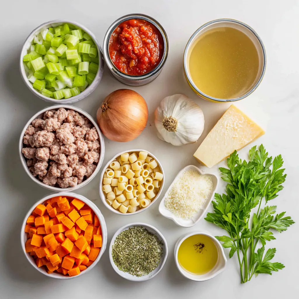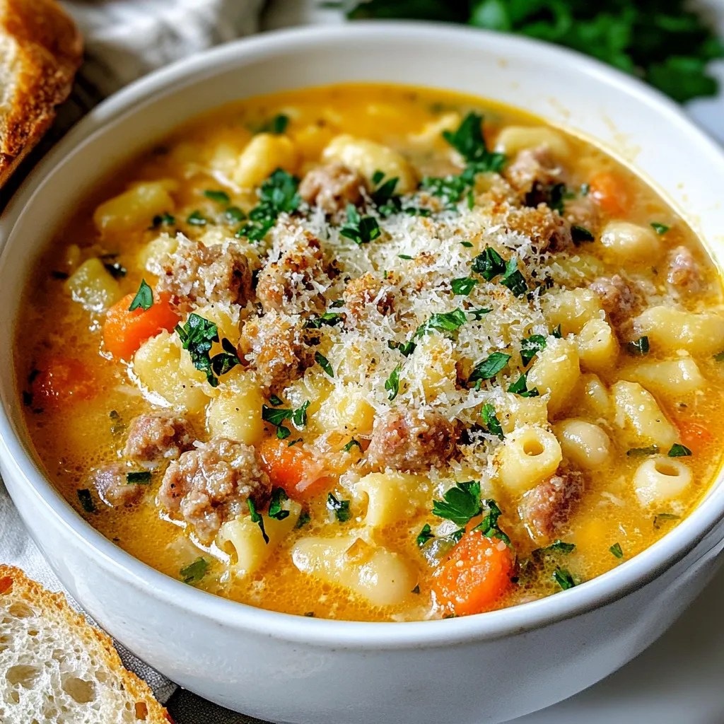 A hearty and creamy soup featuring Italian sausage, ditalini pasta, and fresh vegetables, perfect for a comforting meal.