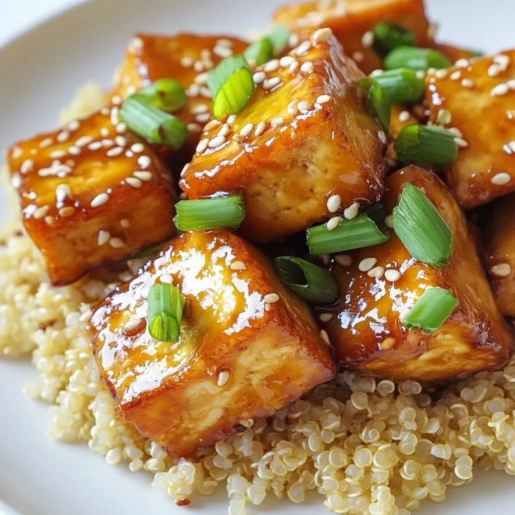 - 14 oz firm tofu, thoroughly pressed and cut into 1-inch cubes - 3 tablespoons cornstarch - 2 tablespoons vegetable oil (preferably canola or sunflower) - 3 cloves garlic, finely minced - 1/4 cup honey (or maple syrup for a vegan option) - 1/4 cup soy sauce (low sodium preferred) - 1 tablespoon rice vinegar (or apple cider vinegar) - 1/2 teaspoon red pepper flakes (adjust based on your spice preference) - 2 green onions, thinly sliced (for garnish) - Sesame seeds (for garnish) - Best Types of Tofu for Crispiness: Firm tofu works best. It holds its shape and crisps up well. Extra-firm tofu is also great if you want even more texture. Avoid silken tofu as it’s too soft. - Substitutions for Honey (Vegan options): For a vegan option, use maple syrup instead of honey. It provides a similar sweetness and flavor. Agave nectar is another option if you want to mix things up. - Choosing Low Sodium Soy Sauce: Low sodium soy sauce is best for this dish. It keeps the flavor rich without being too salty. This helps balance the sweetness of the honey or maple syrup. {{ingredient_image_2}} Pressing Tofu for Optimal Texture To get the best texture, you must press the tofu. Wrap it in paper towels. Place a heavy object on top. This removes excess water. Press it for at least 30 minutes. A tofu press works well too. This step makes the tofu firmer and crispier. Cutting Tofu into Uniform Cubes Once pressed, cut the tofu into 1-inch cubes. Make sure to keep them even. This helps them cook evenly. Use a sharp knife for clean cuts. Uniform cubes will help each piece get crispy. Cornstarch Coating Technique In a bowl, add the cubed tofu. Sprinkle 3 tablespoons of cornstarch over it. Gently toss the tofu until all pieces are coated. The cornstarch gives the tofu a crunchy crust. Make sure every piece gets an even layer. Perfect Oil Temperature for Frying Heat 2 tablespoons of vegetable oil in a skillet. Use medium-high heat for best results. Wait until the oil shimmers. This shows the oil is hot enough. Proper temperature prevents sticking and gives a nice crisp. Techniques for Cooking Garlic Lower the heat to medium. Add minced garlic to the skillet. Stir for about 30 seconds. You want it fragrant but not burnt. Garlic adds a lovely flavor to your sauce. Combining Ingredients for the Sauce Next, pour in the honey and soy sauce. Add rice vinegar and red pepper flakes. Stir well to mix everything. Let it simmer for 2-3 minutes. This will blend the flavors nicely. Tossing Tofu in Sauce Return the crispy tofu to the skillet. Toss it in the honey garlic sauce. Make sure each piece is well coated. Let it cook for another 2 minutes. This helps the tofu absorb the sauce. Garnishing with Green Onions and Sesame Seeds Transfer the glazed tofu to a serving dish. Garnish with sliced green onions and sesame seeds. This adds extra color and texture. Enjoy your crispy honey garlic tofu with pride! - Frying Tips for Tofu: Start with firm tofu. Press it well to remove water. This step helps it get crispy. Coat the tofu cubes in cornstarch. This creates a nice layer that fries well. Heat the oil until it shimmers. This shows it is hot enough. - Importance of Not Overcrowding the Pan: Fry the tofu in batches. If you crowd the pan, the tofu will steam. This makes it soggy instead of crispy. Leave space between each piece. This allows hot air to circulate and fry evenly. - Adding More Spice: Alternatives to Red Pepper Flakes: You can use fresh chili or sriracha instead. Both add heat and flavor. For a milder option, use black pepper. This gives a subtle kick without being too hot. - How to Adjust Sweetness: If you find the dish too sweet, reduce the honey. You can also add a splash of vinegar. This balances out the flavors. If you love sweetness, add more honey or maple syrup. - Plating Ideas for Eye-Catching Serving: Serve the tofu on a bed of rice or quinoa. This makes a great base. Add bright vegetables for color, like bell peppers or green beans. Drizzle some sauce on top for a glossy finish. - Pairing Suggestions (Rice, Quinoa, Vegetables): Pair the tofu with steamed vegetables. Broccoli and snap peas work well. A squeeze of lime adds a fresh taste. Enjoy your colorful plate and tasty meal! Pro Tips Press Tofu Well: Ensure you press the tofu adequately for at least 30 minutes to remove excess moisture, which results in a firmer texture and better absorption of flavors. Uniform Coating: When coating the tofu with cornstarch, make sure each piece is evenly covered. This ensures consistent crispiness and prevents any soggy spots during frying. Hot Oil is Key: Always let the oil heat until it shimmers before adding the tofu. This will help create a crispy exterior and prevent the tofu from sticking to the pan. Flavor Infusion: After glazing the tofu in the sauce, allow it to cook for a few extra minutes. This step helps the tofu absorb the sweet and savory flavors of the honey garlic sauce more intensely. {{image_4}} You can easily make this dish vegan. Just swap honey for maple syrup. Maple syrup gives a sweet touch. It blends well with garlic and soy sauce. This change makes the dish plant-based and just as tasty. You can use different types of tofu. Silken tofu is softer and creamier. It works well in sauces but may not hold its shape when frying. Extra-firm tofu is denser and crisps up nicely. Choose the type based on your texture preference. Add a citrus twist to your recipe. Lime or lemon juice brightens the flavors. Just a splash can wake up the dish. You can also try different sauces. Teriyaki and sweet and sour sauces bring new tastes. Feel free to experiment and discover your favorite! To keep your crispy honey garlic tofu fresh, follow these tips. First, let the tofu cool to room temperature. Then, place it in an airtight container. Refrigerate it for up to three days. To keep tofu crispy for later, store it separately from the sauce. The sauce can make the tofu soggy. You can save the sauce in another container. Thi