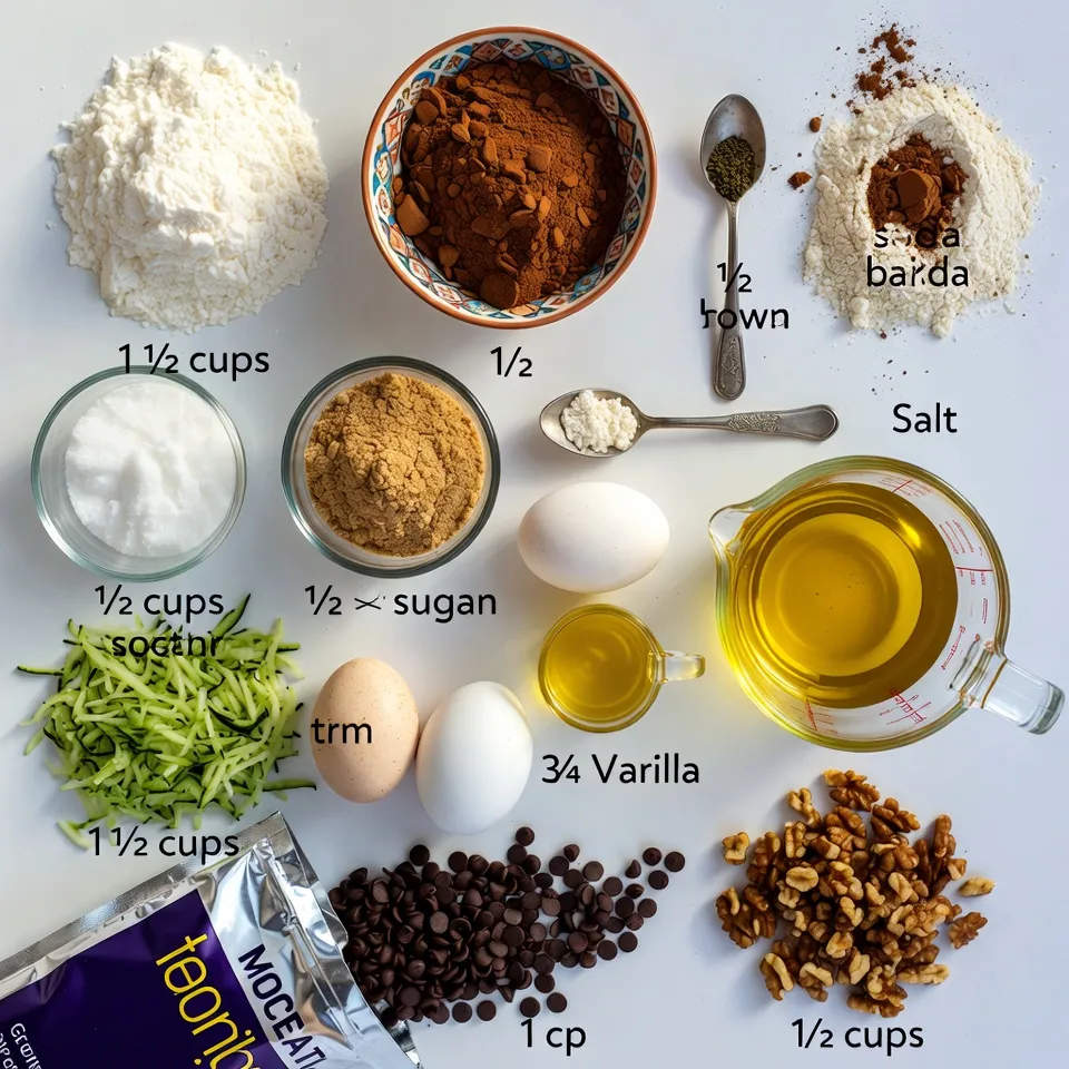 To make a delicious Double Chocolate Zucchini Bread, gather these simple ingredients: - 1 ½ cups all-purpose flour - ½ cup unsweetened cocoa powder - 1 teaspoon baking soda - ½ teaspoon baking powder - ½ teaspoon salt - ½ cup granulated sugar - ½ cup packed brown sugar - 2 large eggs, room temperature - 1 teaspoon pure vanilla extract - ¾ cup vegetable oil - 1 ½ cups grated zucchini (from about 1 medium zucchini) - 1 cup semi-sweet or dark chocolate chips - ½ cup chopped walnuts (optional) Each ingredient plays a key role in creating the perfect texture and flavor. The all-purpose flour gives the bread structure. Cocoa powder adds that rich chocolate taste. Baking soda and baking powder help it rise, while salt enhances all the flavors. The sugars sweeten the bread and keep it moist. Eggs bind the ingredients together, and the vanilla extract adds a warm note. Vegetable oil contributes to the moisture, making each slice tender. Grated zucchini not only adds health benefits but also keeps the bread moist. Finally, the chocolate chips bring a delightful richness, while the walnuts add a nice crunch if you choose to include them. Gather these ingredients, and you’re ready to whip up a mouthwatering treat! {{ingredient_image_2}} - Preheat the oven to 350°F (175°C) and prepare the loaf pan. - Combine the dry ingredients and set aside. Start by preheating your oven. This step ensures your bread bakes evenly. Grease a 9x5-inch loaf pan or line it with parchment paper. This makes the bread easier to remove later. In a medium bowl, whisk together the flour, cocoa powder, baking soda, baking powder, and salt. Mix these well so they blend into one. - Mix the sugars and wet ingredients until smooth. - Incorporate the vegetable oil and grated zucchini. - Combine wet and dry ingredients, being cautious not to overmix. In a large bowl, beat the granulated sugar and brown sugar with eggs and vanilla. Whisk until it is smooth and creamy. Slowly add the vegetable oil while whisking. This step helps create a rich texture. Next, fold in the grated zucchini. Make sure it is spread out evenly. Then, add the dry mixture into the wet one. Stir just until you no longer see dry flour. Be careful not to overmix, as this can make the bread tough. - Fold in chocolate chips and walnuts. - Transfer to the pan and bake, checking for doneness. - Cool before slicing. Now, gently fold in the chocolate chips and walnuts if you choose to use them. This adds texture and flavor. Pour the batter into your prepared loaf pan. Spread it evenly. Bake it in the oven for 50 to 60 minutes. To check if it's done, insert a toothpick into the center. It should come out clean or with a few moist crumbs. Once baked, let the bread cool in the pan for about 10 minutes. After that, place it on a wire rack to cool completely before slicing. Enjoy the deliciousness! - Grated zucchini keeps the bread moist. Use fresh zucchini for the best results. - To check if the bread is done, insert a toothpick in the center. It should come out clean or with a few moist crumbs. - Try different chocolate chips, like dark, milk, or white chocolate. Each adds a unique taste. - Add spices like cinnamon or nutmeg. They give warmth and depth to the flavor. - Serve slices with whipped cream or a scoop of vanilla ice cream. This adds a creamy touch. - A light dusting of powdered sugar makes it look fancy and inviting. It’s a simple trick that impresses! Pro Tips Grate the Zucchini Finely: Use the fine side of a box grater to ensure the zucchini integrates seamlessly into the batter, adding moisture without making the bread soggy. Room Temperature Ingredients: Make sure your eggs are at room temperature for better emulsification, resulting in a smoother batter and a more tender loaf. Don't Overmix: Mix the batter just until combined to prevent the bread from becoming tough; a few lumps are perfectly fine! Cool Completely Before Slicing: Allowing the bread to cool fully on a wire rack helps it firm up and makes slicing easier, ensuring clean cuts. {{image_4}} You can make Double Chocolate Zucchini Bread healthier. Here are two easy swaps: - Substitute whole wheat flour for all-purpose flour. It adds more fiber and nutrients. - Use a sugar alternative for a low-sugar option. This helps reduce calories without losing sweetness. You can get creative with flavors in this bread. Consider these ideas: - Add different nuts like pecans or almonds. They add crunch and flavor. - Incorporate dried fruits such as cranberries or cherries. They bring a nice sweetness. You can adapt this recipe for specific diets. Here are some options: - Make it gluten-free with gluten-free flour. This keeps the texture soft and moist. - For a vegan version, use flax eggs and plant-based oil. This keeps the bread rich and tasty. You can keep your Double Chocolate Zucchini Bread fresh for a few days. Store it in an airtight container at room temperature. It will stay good for up to 3 days. This way, you can enjoy a slice whenever you like! If you want to save some for later, freezing works great. Wrap the bread tightly in plastic wrap, then in foil. It can last for up to 3 months in the freezer. When you are ready to eat it, simply take it out and thaw it in the refrigerator. This keeps it moist and tasty. Always check your bread before eating. If you see any discoloration or notice any off smells, it’s best to discard it. Keeping an eye on these signs ensures you enjoy only the best treats! How do I ensure my Double Chocolate Zucchini Bread stays moist? To keep your bread moist, use fresh grated zucchini. Zucchini adds moisture. Also, don't overbake. Check with a toothpick for doneness. If it comes out with a few crumbs, it's done. Can I use frozen zucchini for this recipe? Yes, you can use frozen zucchini. Just thaw it first and squeeze out excess water. This helps keep the bread from getting too wet and soggy. What can I substitute for eggs if making it vegan? You can use flax e