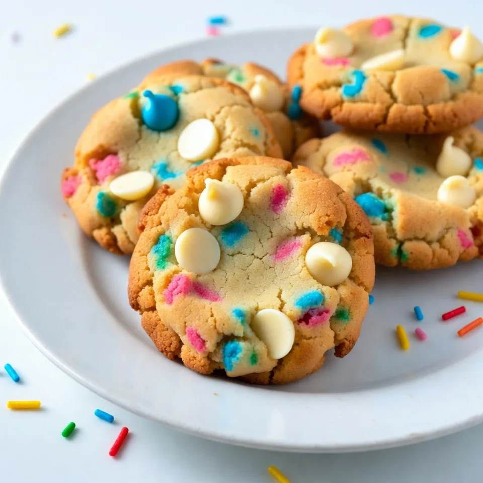 Delicious and festive cookies filled with rainbow sprinkles and white chocolate chips, perfect for celebrations.