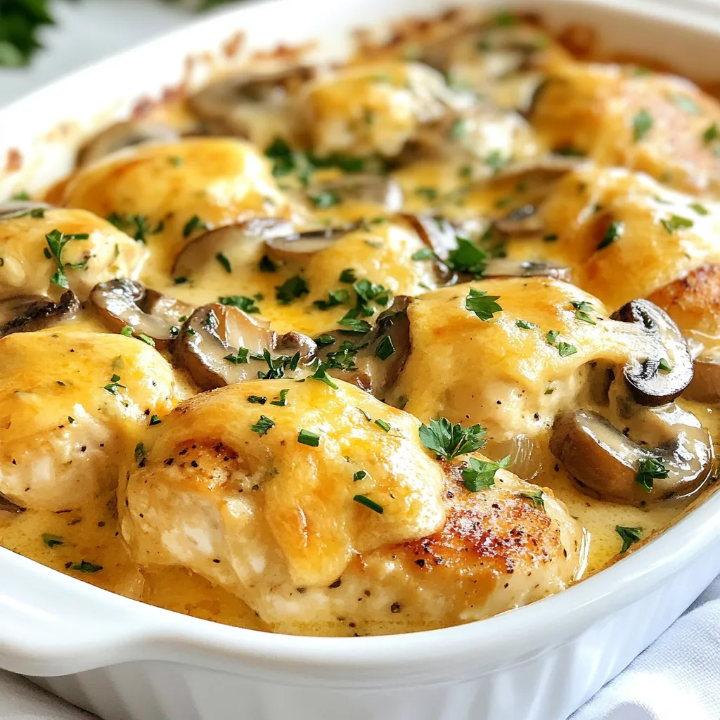 - 4 boneless, skinless chicken breasts - 2 cups button mushrooms, sliced - 1 medium onion, diced - 4 cloves garlic, minced - 1 cup chicken broth - 1 cup heavy cream - 1 teaspoon dried thyme - 1 teaspoon dried oregano - 1 cup shredded sharp cheddar cheese - 1 cup cooked rice (white or brown) - 2 tablespoons olive oil - Salt and freshly ground black pepper to taste - Fresh parsley, chopped (for garnish) When making garlic mushroom chicken casserole, these ingredients create a rich taste. The chicken provides protein, while mushrooms add texture. Garlic brings a strong flavor, and cheese adds creaminess. The rice acts as a great base, soaking up all those delicious juices. - 1/2 cup frozen peas - 1/2 teaspoon smoked paprika - 1 cup spinach, chopped Adding frozen peas or spinach can boost nutrition. Smoked paprika gives a hint of smokiness. Experiment with these options to find your favorite mix. - Large skillet - Casserole dish - Wooden spoon - Measuring cups and spoons - Sharp knife and cutting board These tools help you prepare this dish smoothly. A large skillet is key for sautéing. The casserole dish holds your masterpiece while it bakes. Having these tools ready makes cooking fun and easy. {{ingredient_image_2}} Start by heating 2 tablespoons of olive oil in a large skillet over medium heat. Add 1 medium diced onion and sauté it for about 3-4 minutes until it turns clear. Next, stir in 4 cloves of minced garlic and 2 cups of sliced button mushrooms. Cook them for 5-7 minutes. The mushrooms will get soft and release their juices. While they cook, season 4 boneless, skinless chicken breasts with salt, black pepper, 1 teaspoon of dried thyme, and 1 teaspoon of dried oregano. Once the mushrooms are ready, push the mixture to one side. Place the seasoned chicken breasts on the other side. Sear them for about 3-4 minutes on each side until they are golden brown. Now, carefully pour in 1 cup of chicken broth and 1 cup of heavy cream. Stir the mixture well to combine all the flavors. Let it simmer gently for a moment. Then, add in 1 cup of cooked rice and half of 1 cup of shredded sharp cheddar cheese. Mix everything together until well combined and heated through. Transfer the entire mixture into a greased casserole dish, spreading it evenly. Sprinkle the remaining cheddar cheese on top. Cover the dish with aluminum foil. Bake in your preheated oven at 375°F (190°C) for 20 minutes. After this, remove the foil and bake for another 10-15 minutes. You want the cheese to be bubbly and golden brown. Once out of the oven, let it rest for a few minutes. Before serving, add some chopped fresh parsley on top for a pop of color. Enjoy your meal! To get juicy chicken, start with fresh breasts. Make sure they are about the same size. This helps them cook evenly. Season them well with salt, pepper, thyme, and oregano. Sear the chicken in a hot skillet. Cook each side for 3-4 minutes until brown. This step locks in the flavor. Don't overcrowd the pan; work in batches if needed. After cooking, let the chicken rest for a few minutes. This helps the juices stay inside. Cheese adds great flavor to your casserole. Sharp cheddar cheese works well. It melts nicely and gives a rich taste. You can also try gouda or mozzarella for a different twist. For a sharper bite, use crumbled feta or blue cheese. Mix different cheeses for a fun flavor blend. Sprinkle the cheese on top in the last few minutes of baking. This creates a bubbly, golden crust that everyone loves. To make your casserole even creamier, add more heavy cream. You can also mix in some cream cheese. This gives a rich and smooth texture. If you want a lighter option, try sour cream or Greek yogurt. These ingredients add creaminess without being too heavy. Stir them in just before baking to keep the texture. For extra flavor, consider adding a splash of white wine to the broth. This adds depth and richness to the dish. Pro Tips Choose the Right Mushrooms: Opt for cremini or shiitake mushrooms for a deeper flavor compared to button mushrooms. Perfectly Season the Chicken: Allow the chicken to marinate with spices for at least 30 minutes before cooking to enhance flavor. Add Fresh Herbs: Incorporate fresh thyme or oregano right before serving for an aromatic boost. Ensure Even Cooking: Cut chicken breasts to a uniform size for consistent cooking and tenderness throughout. {{image_4}} You can change the chicken in this dish. Try turkey breasts for a leaner option. Pork chops also work well, adding a different flavor. If you want to keep it easy, use rotisserie chicken. Just shred it and mix it in when adding the rice. This saves you time and still gives great taste. If you prefer a vegetarian dish, swap chicken for tofu. Use firm tofu for the best texture. Cut it into cubes and sauté it with the mushrooms and onions. Use vegetable broth instead of chicken broth for the sauce. This change keeps the dish hearty and flavorful while adding healthy plant protein. Want more nutrition? Add veggies! Broccoli, spinach, or bell peppers fit well. Chop them up and mix them in with the mushrooms. Carrots also add color and sweetness. This not only boosts the nutrition but also makes your dish look more appealing. Don't be shy to experiment with your favorite vegetables! Store leftover garlic mushroom chicken casserole in an airtight container. Let it cool to room temperature before sealing. This helps keep flavors fresh. Store it in the fridge for up to three days. If you want to enjoy it later, freezing is a great option. To reheat, place the casserole in an oven-safe dish. Cover it with foil to prevent it from drying out. Heat it at 350°F (175°C) for about 20-25 minutes. Stir it halfway through for even warming. You can also microwave individual portions. Heat for a minute at a time, stirring in between. To freeze the casserole, let it cool completely. Transfer it to a freezer-safe container or wrap it tightly with plastic wrap. Label the container with the date.