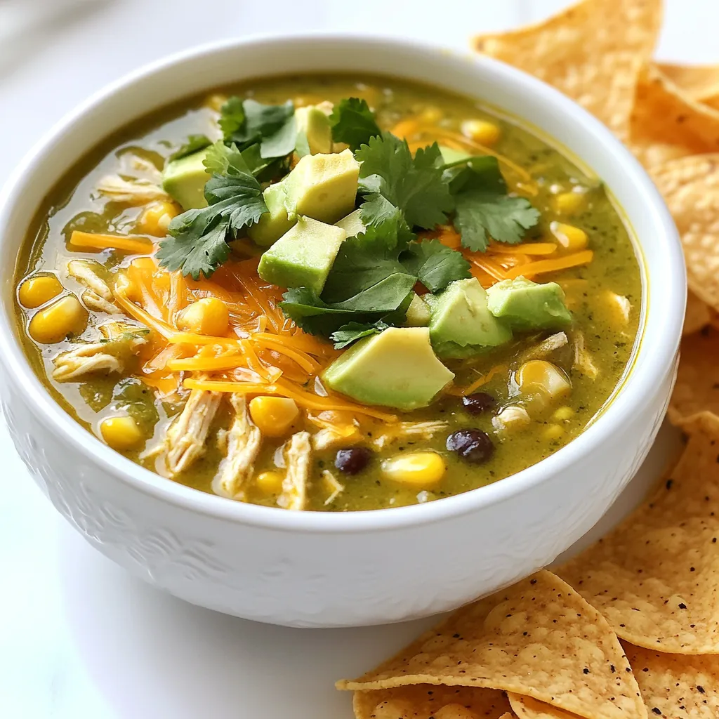 A flavorful and hearty chicken soup with green enchilada sauce, corn, and black beans, topped with cheese and avocado.
