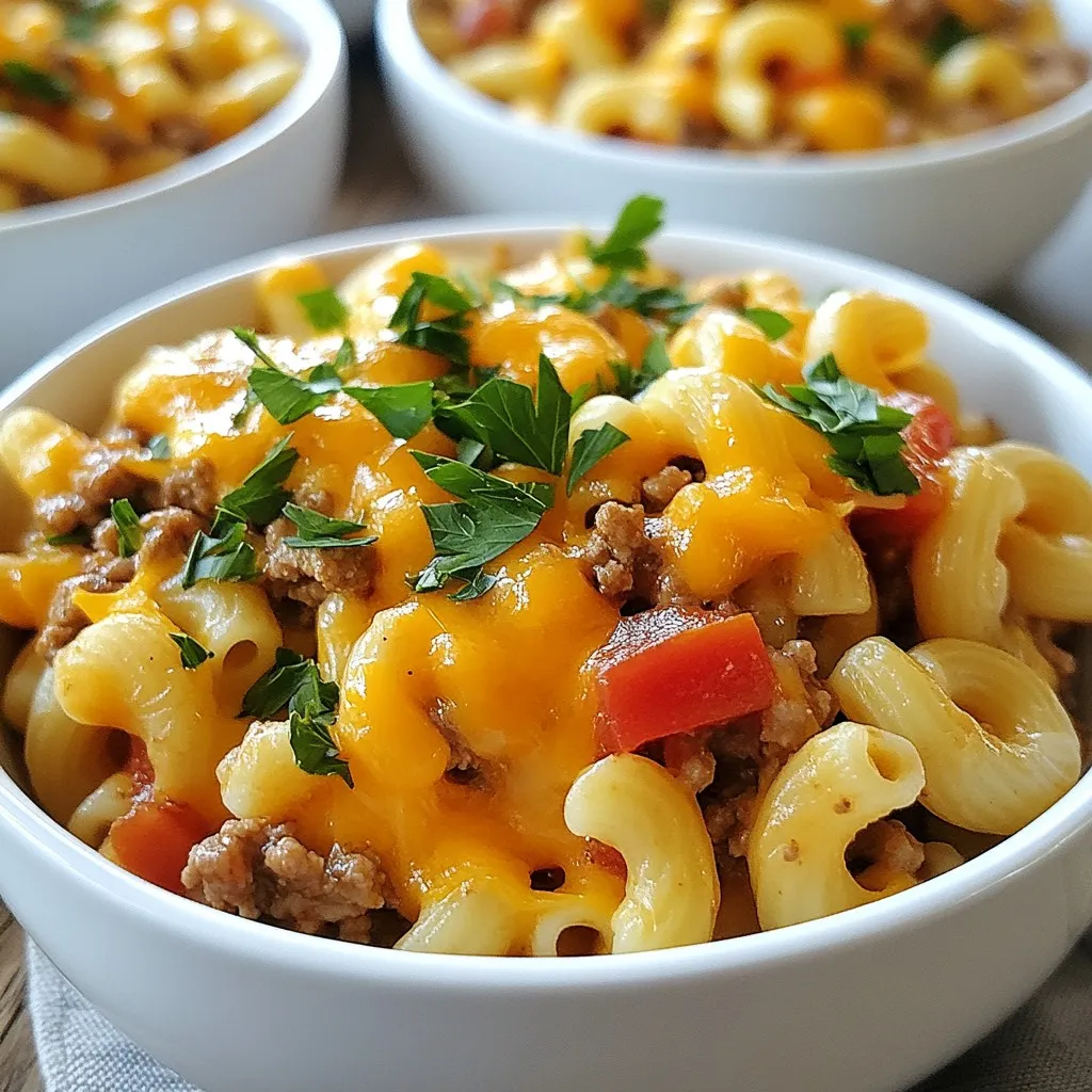 To make a tasty one-pot hamburger helper, you need some basic ingredients. Here’s what you will need: - 1 pound ground beef - 1 small onion, finely diced - 3 cloves garlic, minced - 2 cups elbow macaroni - 4 cups beef broth (preferably low-sodium) - 1 cup diced tomatoes (canned or fresh, drained if using canned) - 2 teaspoons Worcestershire sauce - 1 teaspoon smoked paprika - 1/2 teaspoon freshly ground black pepper - 1 cup shredded sharp cheddar cheese - 1/2 cup sour cream - Fresh parsley, finely chopped (for garnish) These ingredients come together to create a rich and creamy dish that is sure to please everyone. You can customize your one-pot hamburger helper to fit your taste. Here are some optional ingredients you might add: - Bell peppers for sweetness - Mushrooms for an earthy flavor - Spinach for extra greens - Hot sauce for a kick - Different cheese types like mozzarella or pepper jack Adding these ingredients can make your meal unique and fun. If you have dietary needs, don’t worry. You can adjust this recipe easily. Here are some swaps: - Use turkey or chicken instead of beef for a leaner option. - Try plant-based meat for a vegetarian version. - Use vegetable broth for a meat-free dish. - Substitute gluten-free pasta if you need to avoid gluten. These substitutions keep the dish delicious while catering to different diets. {{ingredient_image_2}} Start by grabbing a large pot or a Dutch oven. Heat it over medium heat. Add 1 pound of ground beef, 1 small diced onion, and 3 minced garlic cloves. Stir the mix with a spoon. Cook until the beef turns brown and the onion looks clear. This should take about 5 to 7 minutes. If there is extra fat in the pot, drain it. This step helps keep your dish from being greasy. Next, stir in 2 cups of elbow macaroni. Pour in 4 cups of low-sodium beef broth. Add 1 cup of diced tomatoes, 2 teaspoons of Worcestershire sauce, 1 teaspoon of smoked paprika, and 1/2 teaspoon of black pepper. Mix all the ingredients well. Turn the heat up to bring it to a boil. Once it boils, lower the heat to a simmer and cover the pot. Let it cook for 12 to 15 minutes. Stir every now and then to stop it from sticking. The macaroni will be tender when done, and most of the liquid should be gone. Once the macaroni is ready, take the pot off the heat. Now, stir in 1 cup of shredded sharp cheddar cheese and 1/2 cup of sour cream. Keep stirring until the cheese melts and the dish becomes creamy. For a fresh touch, sprinkle finely chopped parsley on top before serving. Enjoy your meal in bowls, and feel free to add more cheese if you like! To keep the macaroni just right, watch the clock. Cook it for 12-15 minutes. Stir every few minutes to prevent sticking. If you see it getting too soft, take it off the heat. The macaroni will keep cooking after you remove it. Aim for a firm bite, or "al dente." This way, the pasta stays tasty and holds its shape. When adding cheese and sour cream, do it off the heat. This keeps the cheese smooth and creamy. Stir in the cheese a little at a time. Let it melt before adding more. For sour cream, mix it in gently. This helps keep the dish creamy and rich. If you rush, the cheese can clump, and we want a silky finish. You only need a few tools for this dish. A large pot or Dutch oven is key for even cooking. A wooden spoon helps mix ingredients well and won't scratch your pot. Use a ladle for serving; it makes dishing out easy. Lastly, have a cutting board and knife ready for chopping. Keep it simple, and you’ll enjoy cooking even more! Pro Tips Brown the Beef Properly: Ensure the ground beef is well-browned for maximum flavor. This caramelization adds depth to the dish. Choose Your Cheese: For a different flavor profile, try mixing in other cheeses like gouda or pepper jack along with the cheddar. Vegetable Boost: Add chopped bell peppers or spinach for an extra veggie boost that enhances both nutrition and flavor. Leftover Magic: This dish reheats beautifully. Make a larger batch and enjoy leftovers for an easy meal later in the week. {{image_4}} You can easily make this dish vegetarian. Just swap the ground beef for plant-based crumbles. These crumbles mimic the texture of meat and soak up flavors well. Use the same amount, about 1 pound. Cook them just like you would the beef. You’ll still get a hearty, comforting meal that everyone can enjoy. If you need a gluten-free version, use gluten-free pasta. Look for elbow macaroni made from rice or chickpeas. Cook it in the same way. You may need to adjust the cooking time. Keep an eye on it so it doesn’t overcook. This way, you can enjoy the same great taste without the gluten. To change the spice level, you can add or reduce spices. If you like it mild, skip the smoked paprika. For heat, add red pepper flakes or a dash of hot sauce. You can always taste as you go. This lets you find the right balance for your family. Everyone can enjoy a bowl of this dish just the way they like it! After enjoying your Cheesy Beef and Mac Delight, store any leftovers in an airtight container. Let the dish cool to room temperature before sealing. This step helps keep the texture fresh. Place the container in the fridge for up to three days. To reheat, scoop the desired amount into a pot. Add a splash of beef broth or water to keep it moist. Heat over medium-low, stirring often. This method helps the dish stay creamy. You can also use a microwave. Heat in 30-second intervals, stirring in between. If you want to freeze your leftovers, use a freezer-safe container. Make sure to leave some space at the top, as the dish may expand. It can last for about three months in the freezer. When ready to eat, move it to the fridge for a night to thaw. Reheat using the stovetop or microwave as mentioned above for the best results. Yes, you can make this recipe in advance. Prepare the dish, but do not add cheese or sour cream yet. Store the pot in the fridge for up to three days. When you are ready to serve, reheat it 