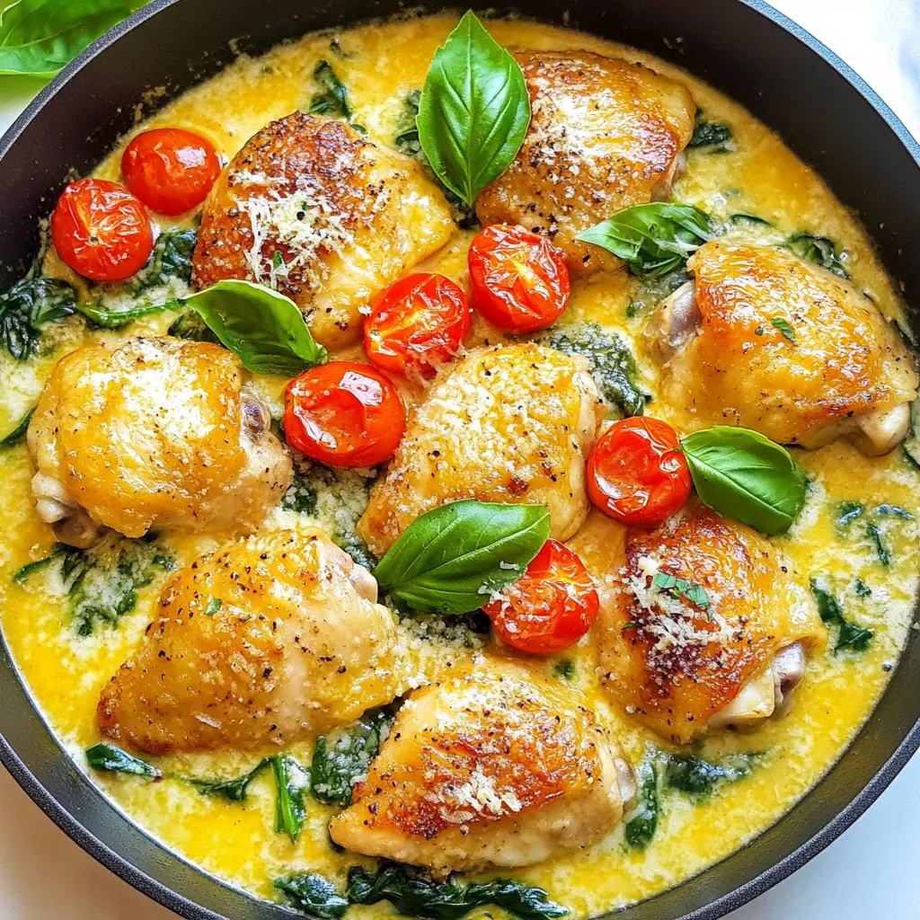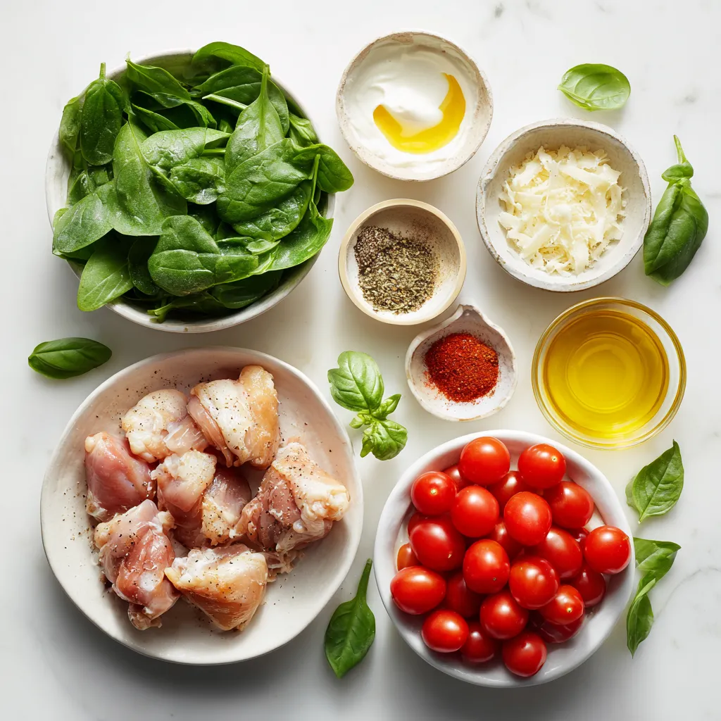 Each ingredient plays a vital role. The chicken thighs provide protein, while spinach offers nutrients and color. Cherry tomatoes add sweetness and juiciness. Olive oil is great for cooking and flavor. Garlic gives a nice aroma and taste.