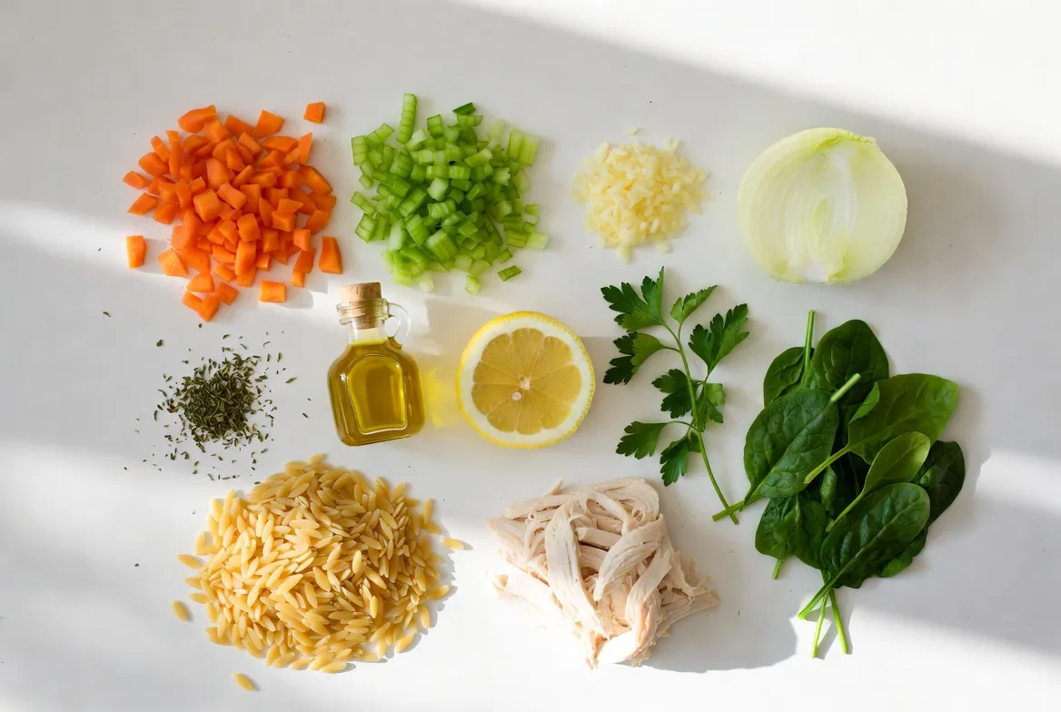 To make Lemon Chicken Orzo Soup, gather these fresh and tasty ingredients: