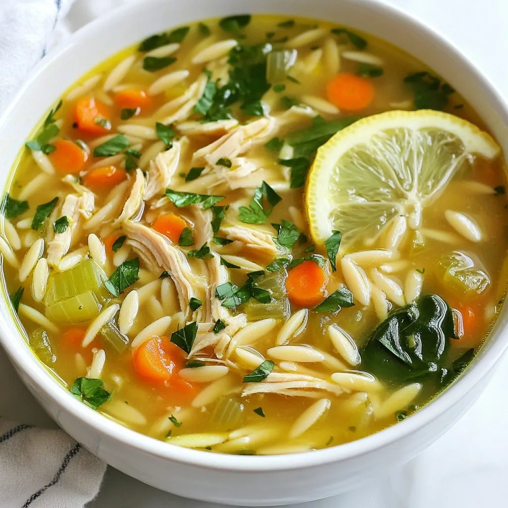 A refreshing and hearty soup featuring chicken, orzo pasta, and vibrant lemon flavors.