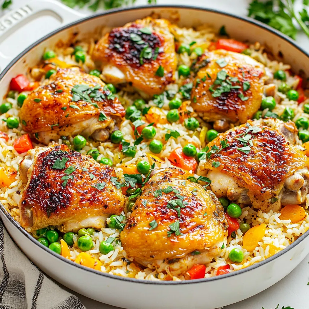 A comforting one-pan dish featuring flavorful chicken thighs baked with rice and vegetables.
