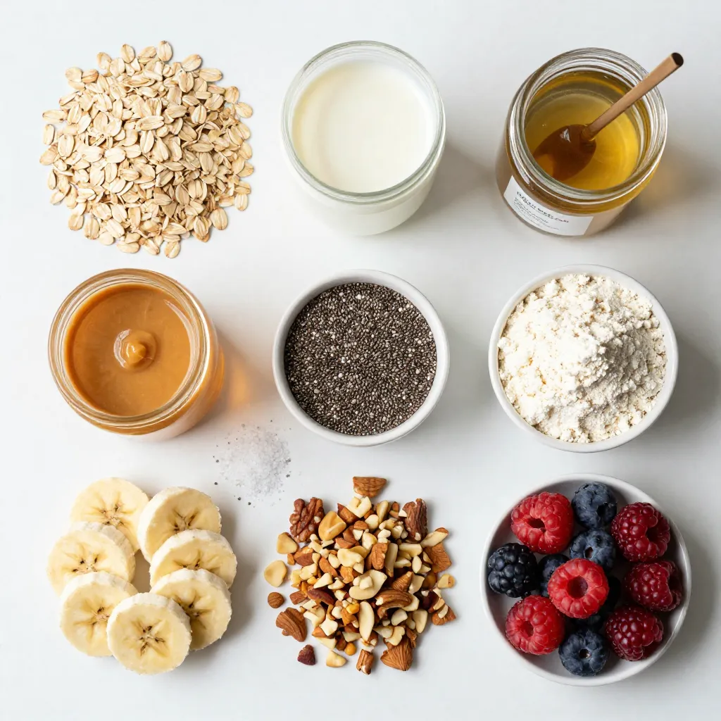 - 1 cup rolled oats - 2 cups almond milk (or milk of your choice) - 1/4 cup natural peanut butter - 2 tablespoons chia seeds - 1 scoop vanilla protein powder - 1 tablespoon maple syrup (optional for added sweetness) - 1/2 teaspoon pure vanilla extract - A pinch of salt These ingredients come together to create a tasty and filling breakfast. Rolled oats serve as the base, providing fiber and energy. Almond milk makes it creamy, but feel free to use any milk you like. Natural peanut butter adds protein and a rich flavor. Chia seeds boost nutrition and help thicken oats. The vanilla protein powder gives it a protein punch. Maple syrup adds sweetness, but it’s optional. A pinch of salt enhances the flavors, making each bite better. - Sliced bananas - Chopped nuts (almonds or walnuts) - Fresh berries Toppings add fun and flavor. Sliced bananas bring sweetness and creaminess. Chopped nuts add crunch and healthy fats. Fresh berries brighten the dish with color and taste. You can mix and match toppings based on your mood or what you have at home. Enjoy experimenting! {{ingredient_image_2}} First, you need to combine the rolled oats and almond milk in a large bowl. Use 1 cup of rolled oats and 2 cups of almond milk. Stir this mix well to coat the oats. Next, add 1/4 cup of natural peanut butter, 2 tablespoons of chia seeds, and 1 scoop of vanilla protein powder. If you want a little sweetness, add 1 tablespoon of maple syrup. Finally, mix in 1/2 teaspoon of pure vanilla extract and a pinch of salt. To mix everything well, use a whisk or fork. This helps break up any clumps. Make sure the mixture is smooth and free of lumps. A good mix ensures the oats soak up the liquid evenly. If you notice any lumps, keep mixing until everything looks creamy and well-blended. Now, divide the mixture into jars or airtight containers. Make sure each jar is sealed tightly. Place the jars in the refrigerator. Let them chill overnight or for at least 4 hours. This soaking time helps the oats soften and absorb flavors. When you’re ready to eat, just stir the oats again. If they’re too thick, add a splash of milk to get your preferred texture. Enjoy your peanut butter protein overnight oats! To get the right texture for your peanut butter protein overnight oats, start with the base. If your oats turn out too thick, just add more milk. A splash of almond milk helps loosen the mix. Stir well to blend it in. You can also adjust sweetness. If you want a sweeter flavor, add more maple syrup. This gives a nice touch to your oats. Just a little can enhance the taste. When preparing your oats, use airtight containers. This keeps the oats fresh and prevents spills in the fridge. Glass jars work great for this! Make a big batch to save time. You can easily double the recipe. This way, you have breakfast ready for several days. Choosing the right nut butter is key. I love using natural peanut butter for its rich taste. You can also try almond butter or cashew butter for a twist. To boost nutrition, think about different protein powders. Vanilla works well, but chocolate or plant-based options can add fun flavors. Experimenting can make your oats even more exciting! Pro Tips Soaking Time Matters: Allowing your oats to soak overnight not only softens them but also enhances their flavor and nutritional profile. Customize Your Sweetness: Adjust the amount of maple syrup based on your preference; you can also substitute it with honey or agave syrup for variety. Protein Boost: For an extra protein kick, consider adding an additional half scoop of protein powder or topping with Greek yogurt before serving. Flavor Variations: Experiment with different nut butters like almond or cashew to create unique flavor profiles for your oats. {{image_4}} You can make your peanut butter protein overnight oats even more fun! Try a chocolate peanut butter version. Just add 2 tablespoons of cocoa powder. This adds a rich chocolate flavor that pairs well with peanut butter. Another great option is fruit-infused oatmeal. Simply mix in your favorite fruits. You can use berries, sliced bananas, or even diced apples. These fruits not only add flavor but also boost the nutrition. If you need a gluten-free version, make sure to choose certified gluten-free oats. These oats are processed in a way that prevents cross-contamination. This keeps your meal safe and delicious. For milk, you can use alternative options like oat milk or coconut milk. These can give your oats a unique flavor while keeping them gluten-free. You can easily adjust the protein levels in your oats. If you want more protein, add another scoop of protein powder. For a lighter option, use Greek yogurt instead of some or all of the protein powder. If you prefer lower-carb variations, substitute rolled oats with cauliflower rice. This will change the texture but keeps your meal healthy. You can also reduce the maple syrup or skip it to lower sugar content. To keep your peanut butter protein overnight oats fresh, use airtight containers or jars. These containers prevent air from getting in and keep your oats tasty. Glass jars work great for this. They let you see the oats and are easy to clean. You can store your oats in the fridge for up to five days. This way, you can make a batch and enjoy them throughout the week. Just remember to stir them before eating. If the oats seem too thick, add a splash of almond milk to fix the texture. You can also freeze your overnight oats if you want to store them longer. To freeze, divide your oats into individual containers. Leave some space at the top of each container because the oats will expand as they freeze. When you're ready to eat, take one container out and let it thaw overnight in the fridge. If you're in a hurry, you can thaw them in the microwave. Just use low power to keep the oats from getting mushy. To keep the taste and texture, avoid freezing oats with fresh toppings. Add those right before you eat. This way, your oats will stay creamy,