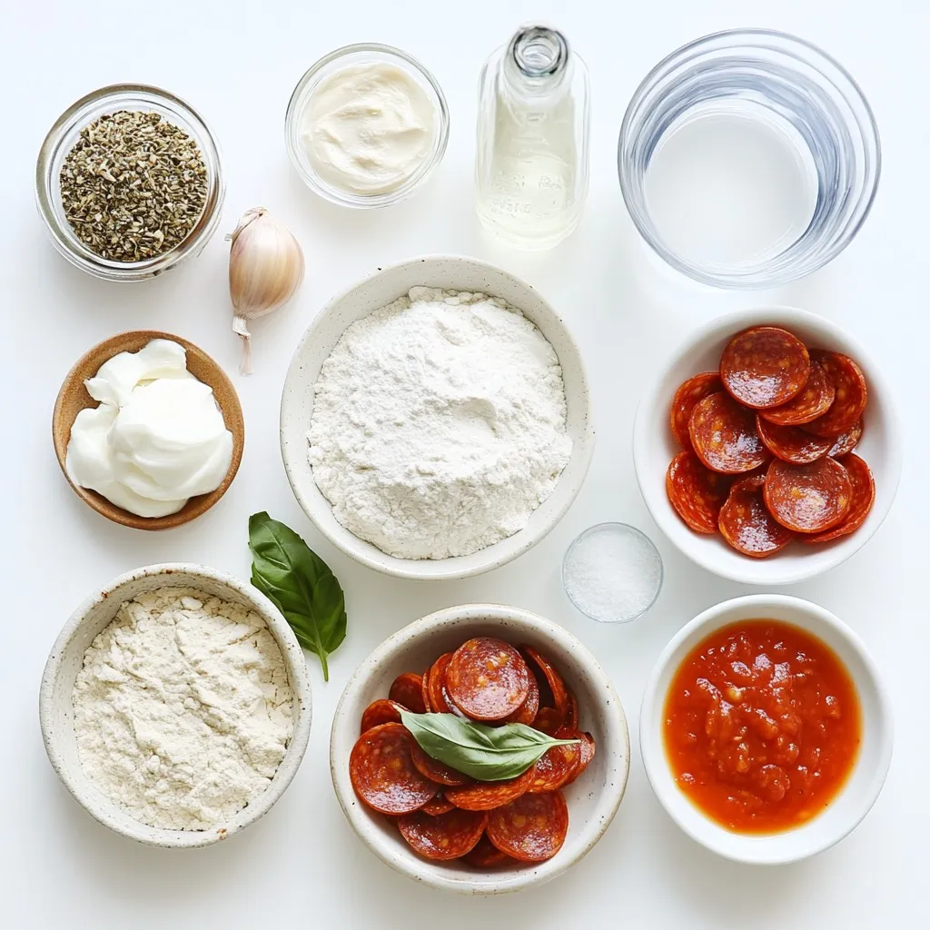 Whole wheat flour offers fiber and nutrients, aiding digestion. Protein powder boosts protein intake, perfect for muscle recovery. Baking powder helps the rolls rise, giving them a light texture. Garlic powder adds flavor and has health benefits, like boosting the immune system. Onion powder enhances taste while providing antioxidants. Dried oregano offers a hint of earthiness and may have anti-inflammatory properties. Salt is essential for flavor balance. Greek yogurt adds moisture and creaminess, plus protein for muscle support. Water binds the ingredients, keeping the dough cohesive. Mozzarella cheese brings melty goodness and calcium for strong bones. Sliced pepperoni adds savory taste and protein, making the rolls hearty. Pizza sauce serves as a tasty dip, rounding out the meal.