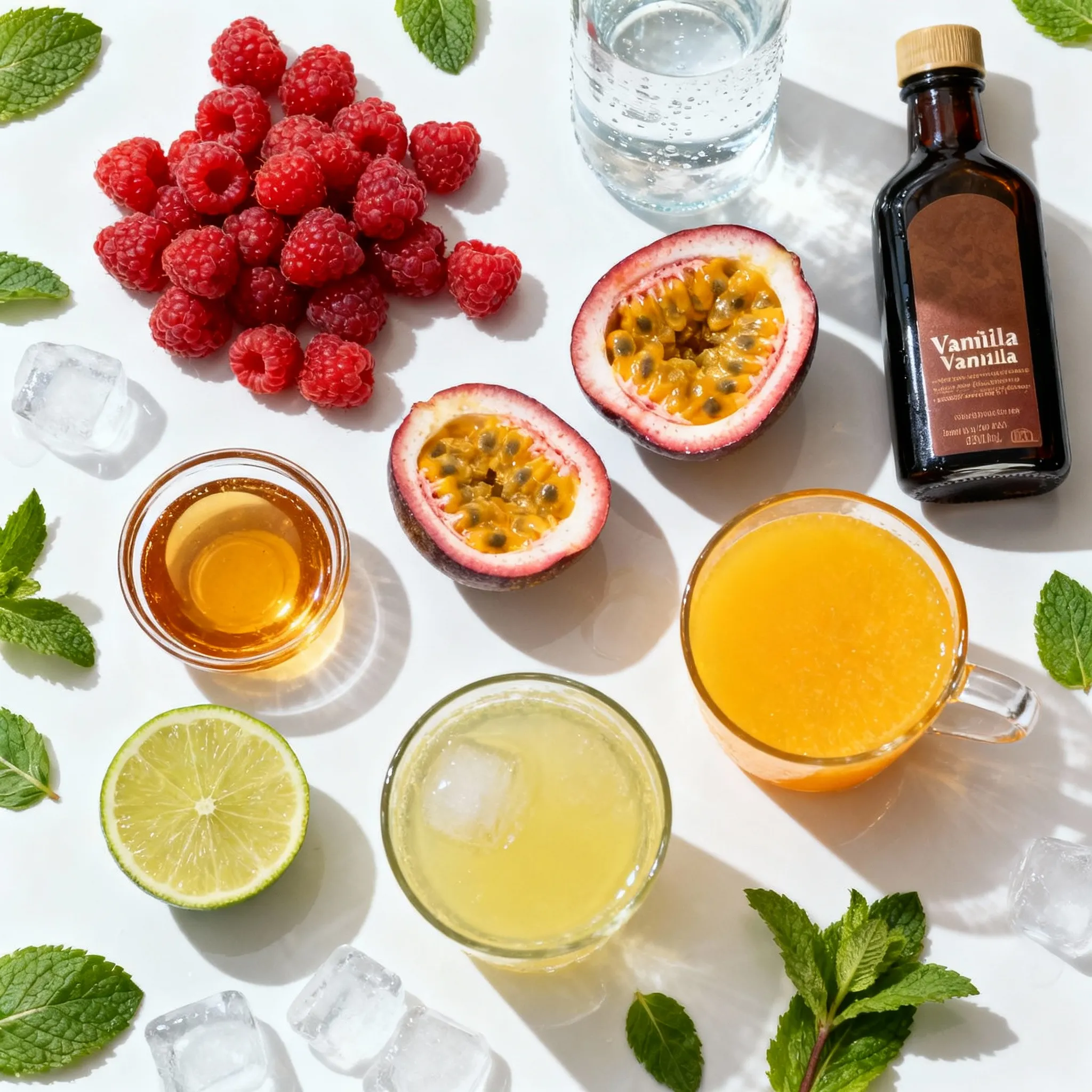 Start by gathering your fresh raspberries and passionfruits. Place them in a blender along with the agave syrup, lime juice, and vanilla extract. Blend this mixture until it is smooth and vibrant. This step brings out the rich flavors of the fruits.