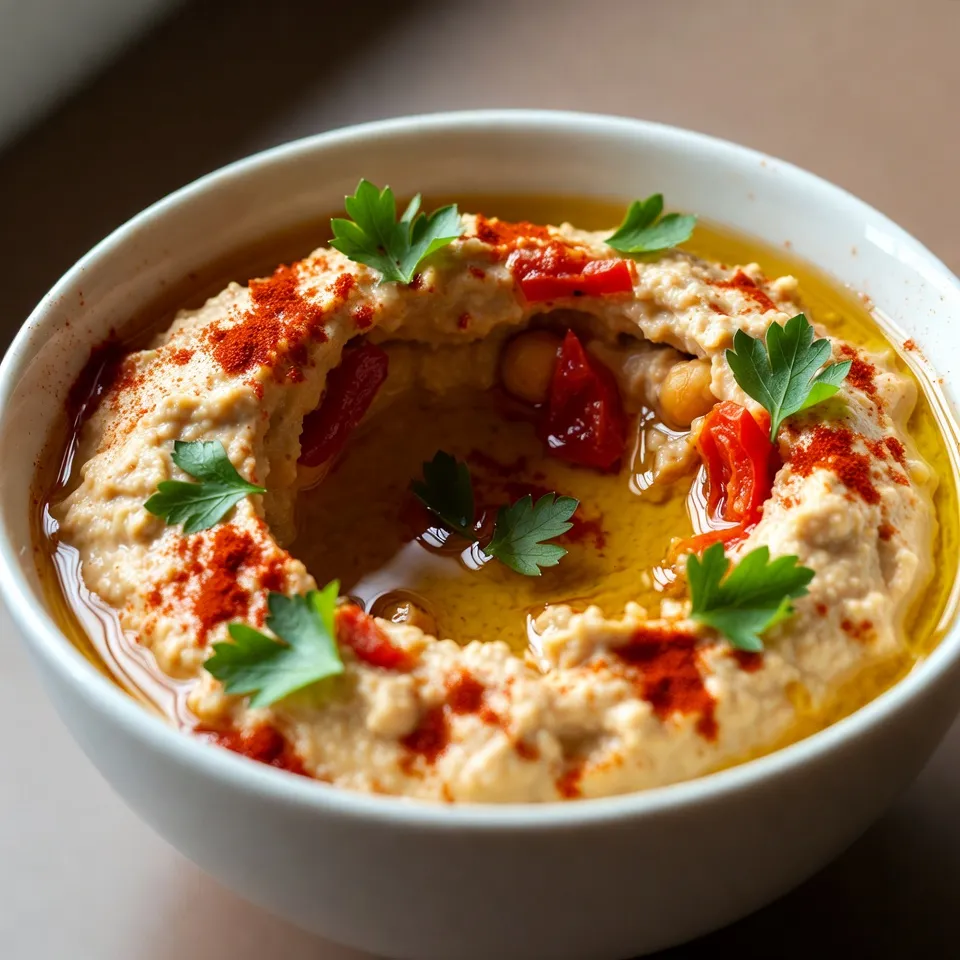 A creamy and flavorful hummus made with roasted red peppers, perfect as a dip or spread.