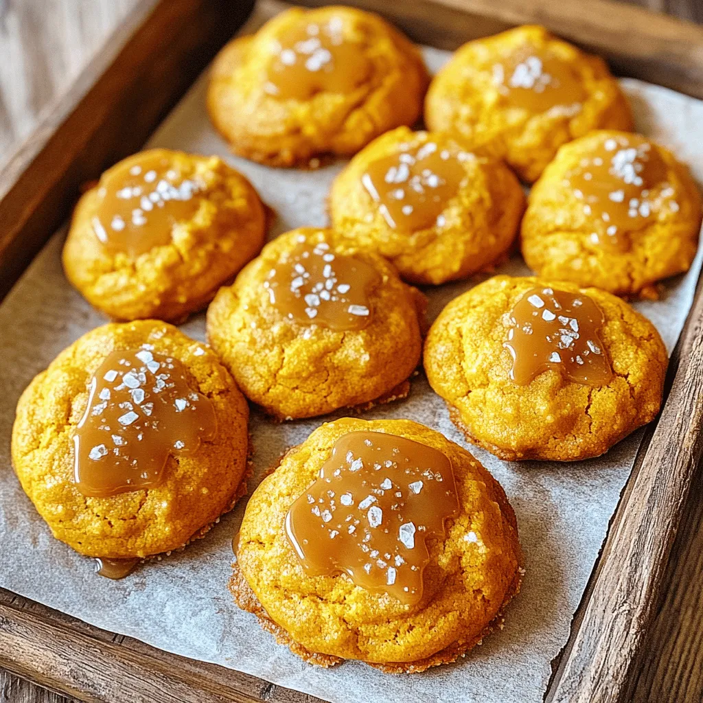 - 1 cup pumpkin puree - 1/2 cup unsalted butter, softened - 1 cup brown sugar, packed - 1/2 cup granulated sugar - 1 large egg - 1 teaspoon vanilla extract - 2 cups all-purpose flour - 1 teaspoon baking soda - 1/2 teaspoon baking powder - 1 teaspoon ground cinnamon - 1/2 teaspoon ground ginger - 1/4 teaspoon nutmeg - 1/4 teaspoon salt - 1 cup salted caramel sauce (store-bought or homemade) - Sea salt flakes for topping - Chocolate chips - Nuts (e.g., pecans or walnuts) - Vegan alternatives for butter and egg - Gluten-free flour options These ingredients make Salted Caramel Pumpkin Cookies a delight. The pumpkin puree gives them a moist texture and rich flavor. You can use chocolate chips or nuts for extra fun. If you need vegan options, swap the butter and egg for plant-based versions. You can also use gluten-free flour if you prefer. This recipe is flexible, so feel free to make it your own! - Preheat oven to 350°F (175°C). - Prepare baking sheet with parchment paper. - Cream the butter and sugars together in a large bowl. - Incorporate pumpkin, egg, and vanilla extract into the mixture. - Mix dry ingredients in a separate bowl. - Gradually combine wet and dry mixtures until just mixed. - Fold in salted caramel sauce gently. - Scoop dough onto prepared baking sheet, leaving space between each scoop. - Bake for 12-15 minutes until edges are golden. - Check cookie doneness by looking for set centers that are soft. - Cool cookies on baking sheet for a few minutes. - Transfer to wire rack to cool completely. - Drizzle cookies with caramel and sprinkle sea salt on top. To make the best salted caramel pumpkin cookies, avoid overmixing the dough. Mix until just combined. This keeps your cookies soft and chewy. Let your cookies cool for at least 10 minutes on the baking sheet. This helps them firm up and enhance their flavor. After that, move them to a wire rack to cool completely. You can serve these cookies in fun ways. Place them on a decorative platter. Add a small bowl of extra salted caramel for dipping. This adds a nice touch. These cookies pair well with coffee or milk. The sweet and salty flavors balance perfectly with a warm drink. Watch your baking temperature! If your oven runs hot, the cookies may burn. Always check with an oven thermometer. Also, measure your ingredients carefully. Too much flour can make the cookies dry. Use the spoon and level method for accuracy. This ensures your cookies turn out great every time. {{image_4}} You can take these cookies to a new level by adding spices. Try a pinch of cloves or allspice for extra warmth. These spices blend well with pumpkin and caramel. They add depth and complexity to each bite. You can also play with the type of caramel you use. Swap store-bought caramel for homemade. This adds a personal touch and can enhance the flavor. You might even try using flavored caramel, like vanilla or sea salt. Each option gives a new twist to your cookies. If you need a gluten-free option, use almond or coconut flour instead of all-purpose flour. Both flours work well and keep the cookies soft. They also maintain the rich flavor we love. For those watching sugar intake, consider low-sugar or sugar-free options. Substitute the sugars with a sweetener like stevia or erythritol. This way, you can enjoy these cookies without the extra sugar. Mix-ins can change the game for these cookies. You can add chocolate chips for a rich taste. Dark or milk chocolate pairs well with pumpkin and caramel. Dried fruit like cranberries or raisins can also enhance flavor. They add chewiness and a bit of tartness. You can even experiment with different nut butters in the dough. Peanut butter or almond butter adds a nutty taste. Each mix-in can create a unique cookie experience. To keep your salted caramel pumpkin cookies fresh, store them in an airtight container. This helps to keep the cookies soft and moist. If you want to enjoy them later, freezing is a great option. Place the cookies in a single layer on a baking sheet. Freeze until firm, then transfer to a freezer-safe bag or container. This method keeps them from sticking together. At room temperature, these cookies stay fresh for about five days. If you refrigerate them, they can last up to a week. Frozen cookies can be kept for about three months. Just remember to label your container with the date, so you know when to enjoy them. If you freeze your cookies, you can soften them easily. Let them sit at room temperature for about 10-15 minutes before eating. For best results, reheat them in a microwave for just 10-15 seconds. This warms them without drying them out. Enjoy your cookies warm, with a touch of extra salted caramel on top! Pumpkin adds moisture and flavor to the cookies. It keeps them soft and chewy. The warm taste of pumpkin pairs well with spices like cinnamon and ginger. This makes every bite comforting and rich. Yes, you can use fresh pumpkin. First, you need to cook the pumpkin. Cut it in half and remove the seeds. Roast it in the oven at 350°F (175°C) for about 45 minutes. Once soft, scoop the flesh out and blend it until smooth. This will give you fresh pumpkin puree. Making salted caramel sauce is simple. You need: - 1 cup sugar - 6 tablespoons butter, cut into pieces - 1/2 cup heavy cream - 1 teaspoon sea salt 1. In a pan, heat the sugar over medium heat. Stir until it melts and turns amber. 2. Add the butter and stir until melted. 3. Slowly add the cream and stir until smooth. 4. Remove from heat and mix in the salt. Let it cool before using. Yes, you can adapt them. For vegan cookies, use a plant-based butter and a flax egg instead of a real egg. For gluten-free, swap all-purpose flour with almond flour or a blend of gluten-free flours. You can also reduce the sugar or use sugar substitutes for a low-sugar option. Look for a golden edge on the cookies. The center should look set but soft. You can press lightly on the top; it should spring back. If it leaves a mark, they need more time. 