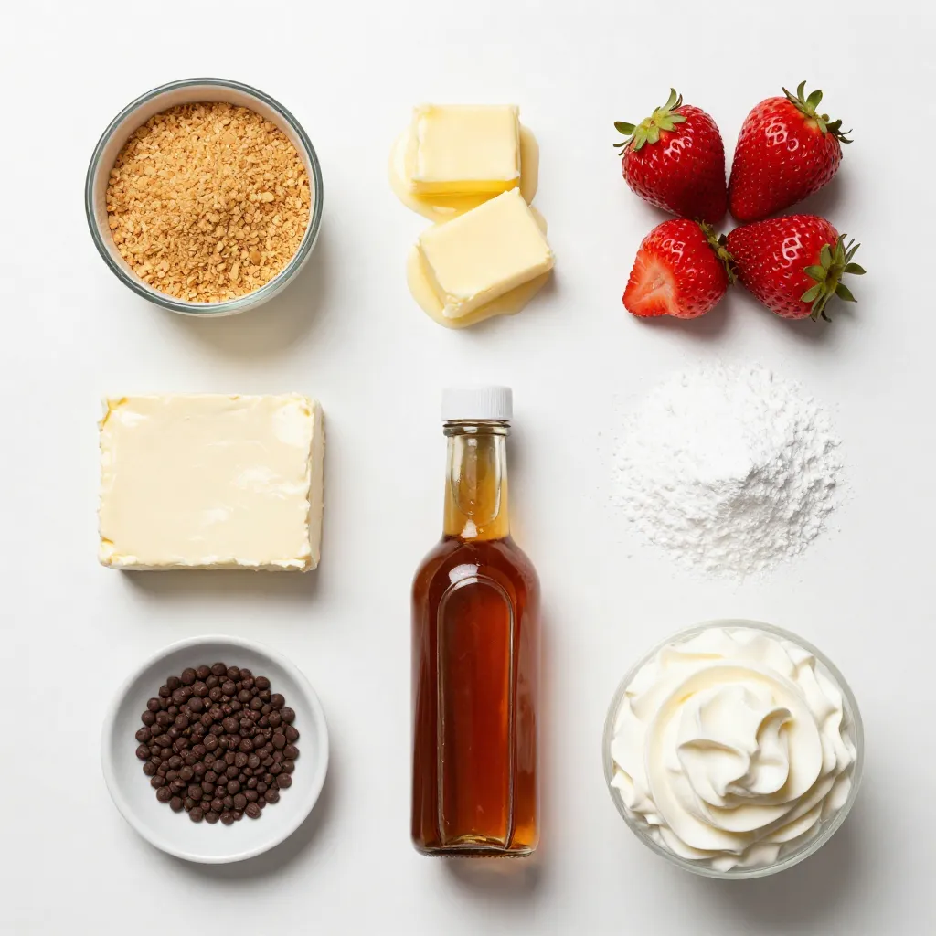 These ingredients make a tasty treat. The crust uses graham crackers and butter for a sweet base. Cream cheese gives the filling a creamy texture. Powdered sugar adds sweetness, while vanilla enhances the flavor. Heavy whipped cream makes the filling light and fluffy. Strawberries are the stars, acting as Santa hats.