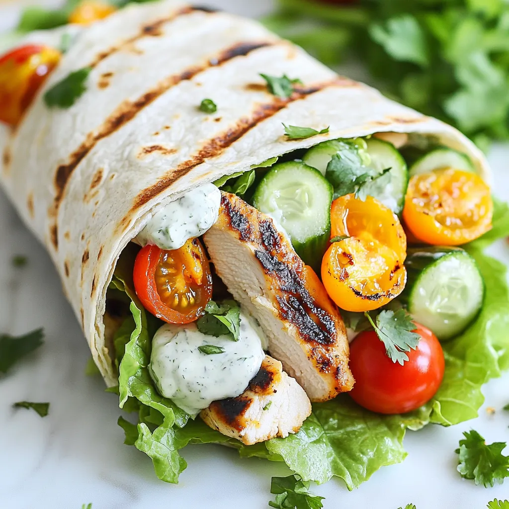 A flavorful and spicy grilled chicken wrap filled with fresh vegetables and a creamy tahini-yogurt dressing.