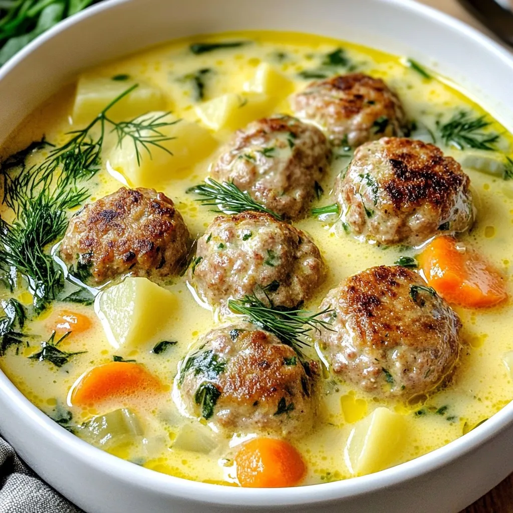 A hearty and creamy soup filled with tender meatballs, fresh vegetables, and rich flavors.