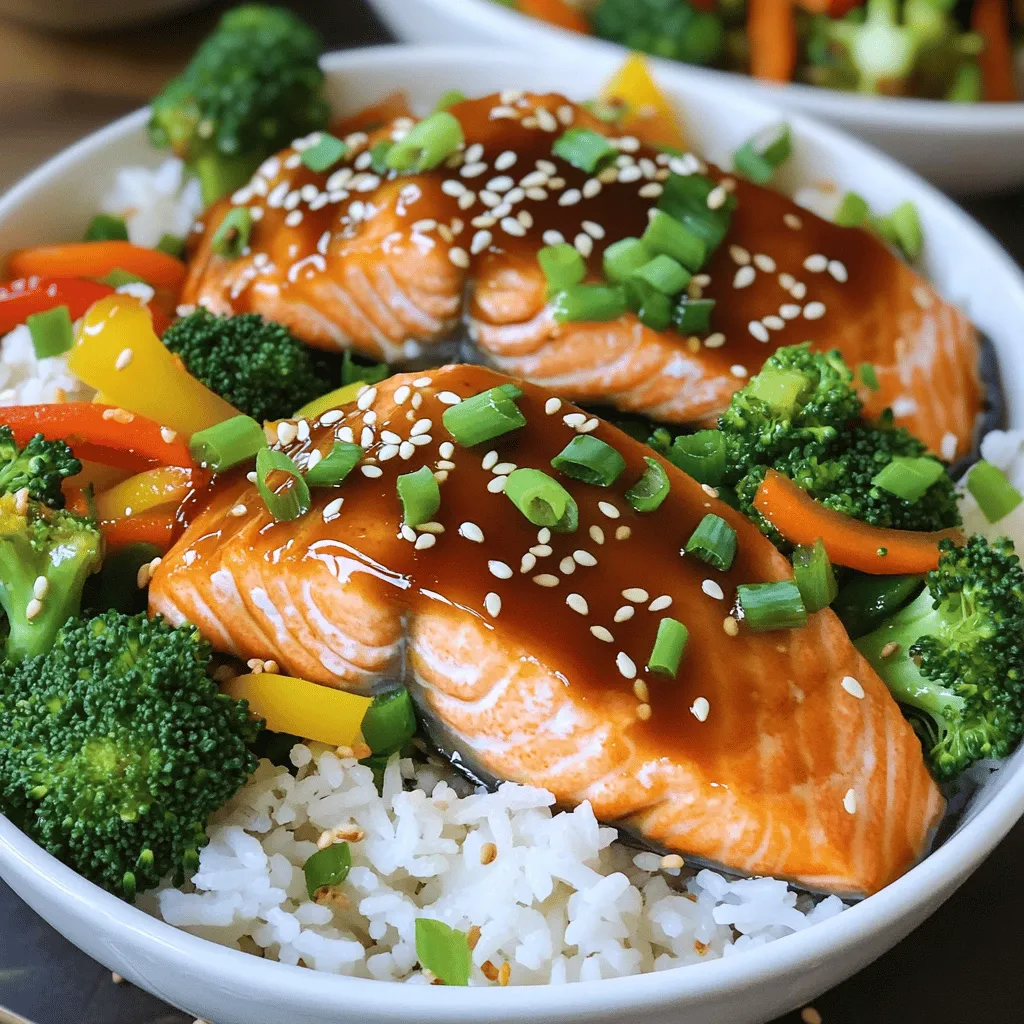 To make teriyaki salmon rice bowls, start by making the sauce. Combine soy sauce, mirin, and sugar in a pot. Heat until the sugar dissolves. Let it cool and thicken. For cooking, first, make the rice. Boil jasmine rice in water, then simmer until tender. Sauté your favorite veggies like broccoli and carrots in olive oil. Cook the salmon in sesame oil for a crispy skin. Brush the salmon with teriyaki sauce while it cooks. Finally, assemble the bowls with rice, veggies, and salmon.