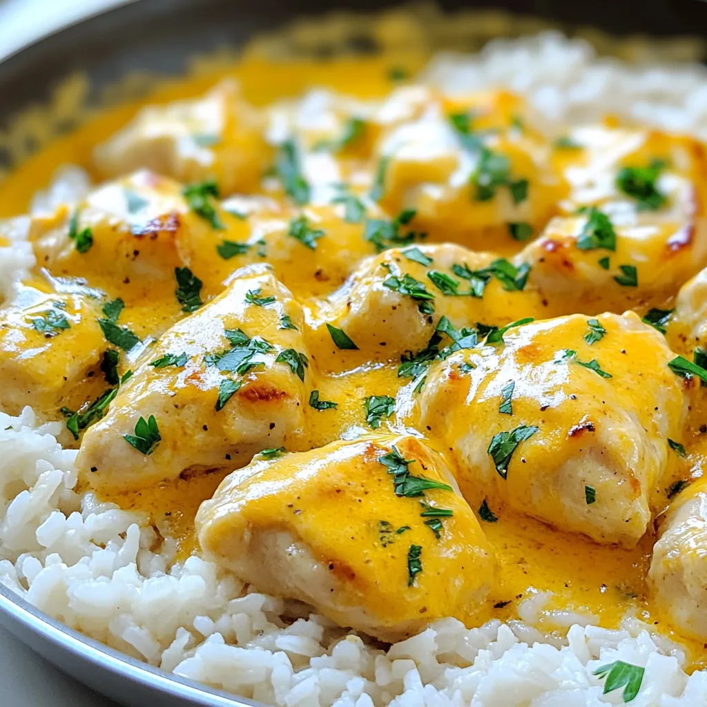 Once the chicken is cooked, lower the heat to medium-low. Pour in 1 cup of heavy cream while stirring gently. This will help create a rich sauce. Let the cream simmer for about 3 to 4 minutes. Stir occasionally until the sauce thickens slightly. Now, gradually add 1/2 cup of shredded cheddar cheese, mixing until it melts completely. This will give your dish a creamy texture. Taste the sauce and adjust the seasoning if needed. Finally, serve the butter chicken over 2 cups of cooked rice or quinoa. Garnish with chopped fresh parsley for that final touch.