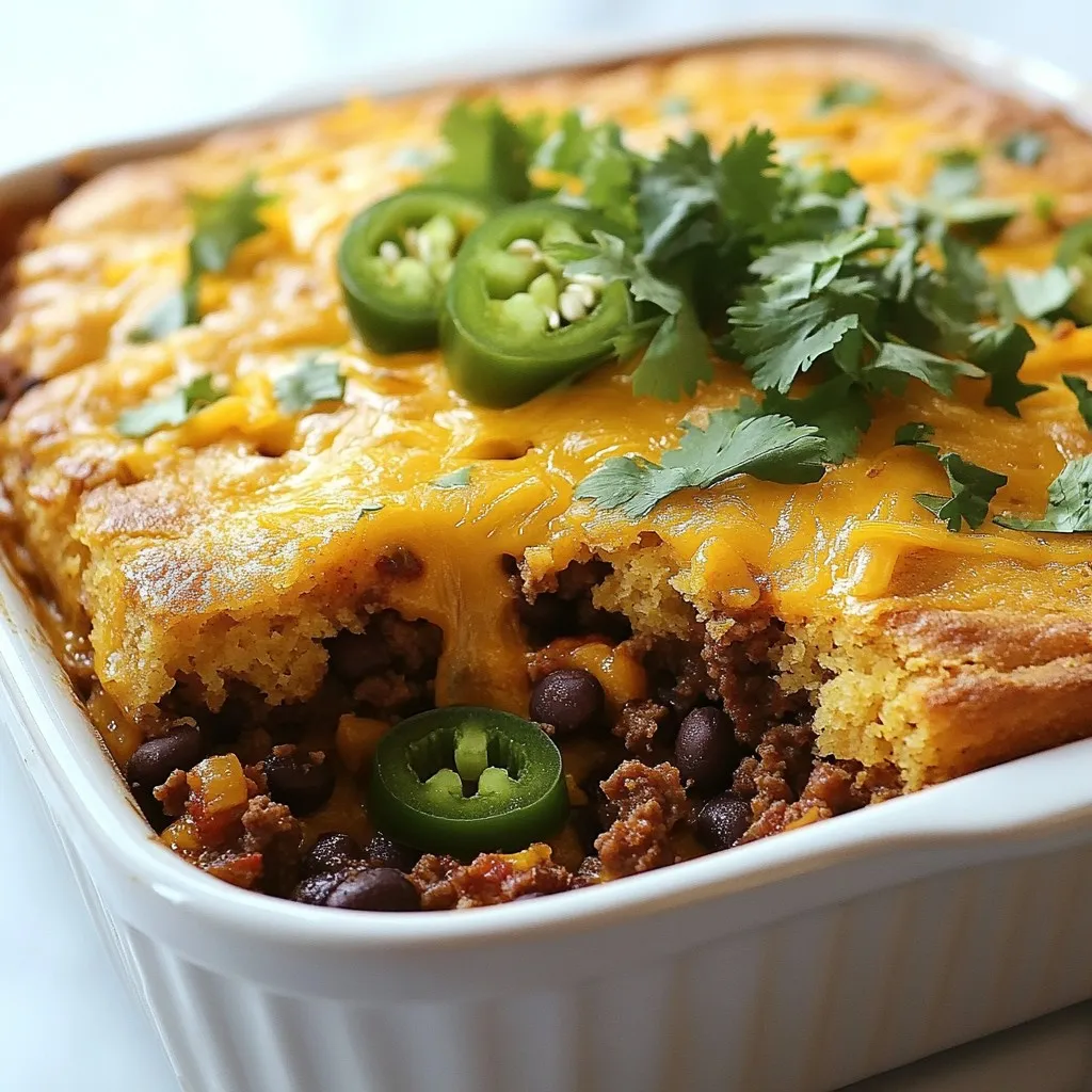 - 1 pound ground beef or ground turkey - 1 can (15 oz) black beans, rinsed and drained - 1 can (15 oz) diced tomatoes with green chilies - 1 tablespoon chili powder - 1 teaspoon ground cumin - 1 teaspoon smoked paprika - 1 cup corn kernels (fresh, frozen, or canned) - 1 package (8.5 oz) cornbread mix - 1 cup milk - 1 large egg - 1 cup shredded sharp cheddar cheese (plus extra for topping) - Salt and freshly ground black pepper to taste - 1/2 cup sliced jalapeños for heat - Fresh cilantro, chopped, for garnish - Large skillet - 9x13 inch casserole dish - Mixing bowl I love the blend of flavors in this dish. The ground beef or turkey gives it a hearty base. The black beans add great texture and protein. Diced tomatoes with green chilies bring a nice zing. The spices, especially chili powder and smoked paprika, create warmth and depth. Corn adds sweetness and balance to the savory notes. For an extra kick, consider adding sliced jalapeños. They spice things up and make it fun. Fresh cilantro brightens the casserole with its fresh flavor. You will need a large skillet to cook the meat and veggies. A mixing bowl helps combine the cornbread mix with milk and egg. A 9x13 inch casserole dish is perfect for baking everything together. This dish is not just filling; it’s also colorful and inviting. You can serve it straight from the oven to the table. Enjoy every bite! {{ingredient_image_2}} Set your oven to 375°F (190°C). This ensures a hot start for your casserole. In a large skillet, add 1 pound of ground beef or turkey. Cook over medium heat. Use a spatula to break the meat apart. Brown it for about 6-8 minutes. Drain any excess fat to keep it lean. Next, add 1 medium diced onion and 2 minced garlic cloves to the skillet. Sauté them for about 3-4 minutes. You want the onion to be soft and fragrant. Then stir in 1 can of black beans, 1 can of diced tomatoes with green chilies, and your spices. Use 1 tablespoon of chili powder, 1 teaspoon of cumin, 1 teaspoon of smoked paprika, and salt and pepper to taste. Cook this mixture for another 5-7 minutes. Stir occasionally until it’s heated through and well mixed. Lightly grease a 9x13 inch casserole dish. Spread the meat and bean mixture evenly on the bottom. In a mixing bowl, whisk together 1 package of cornbread mix, 1 cup of milk, and 1 large egg. Add 1 cup of shredded cheddar cheese and mix until just combined. Now, pour this cornbread batter over the meat mixture. Spread it gently to cover everything. Put the casserole in the preheated oven. Bake for 25-30 minutes. You’ll know it’s done when the cornbread is golden brown. A toothpick inserted in the center should come out clean. Let the casserole cool for about 5 minutes after baking. This helps the layers set. Garnish with chopped fresh cilantro for a burst of color and flavor. Serve directly from the dish. You might add a dollop of sour cream or some green onions for extra taste. Enjoy with tortilla chips for a crunchy side! To get the best cornbread, mix the wet and dry ingredients gently. Overmixing makes the cornbread tough. Aim for a lumpy batter; a few lumps are okay. This means you'll have a soft, fluffy texture. Also, let the batter rest for a few minutes before pouring it on the meat. This helps it rise better. You can add more spices to boost flavor. Try a pinch of cayenne for heat. You can also add oregano or thyme for a fresh twist. Consider mixing in some cornmeal for added texture. Adding a splash of lime juice brightens the dish. Fresh herbs like cilantro not only taste great but also add color. Serve Texas Tamale Pie Casserole in the dish it was baked in. This looks homey and inviting. Top each serving with sour cream or guacamole for creaminess. You can also sprinkle chopped green onions for a fresh crunch. Serve it with tortilla chips for a fun side. Enjoying a side salad adds freshness to every bite. Pro Tips Use Leftovers: This casserole is a great way to use up leftover cooked meats or vegetables. Feel free to mix in whatever you have on hand for a personalized twist! Make it Vegetarian: Substitute the ground meat with additional beans or lentils to create a hearty vegetarian version. You can also increase the amount of corn and diced vegetables. Cheese Variations: Experiment with different types of cheese for added flavor. Pepper jack cheese can give a nice kick, while Monterey Jack offers a milder taste. Freezing Instructions: This casserole freezes well! Prepare it up to the baking point, cover tightly, and freeze. When ready to bake, just thaw it overnight in the fridge and bake as directed. {{image_4}} You can make a great vegetarian tamale pie with just a few swaps. Instead of using ground beef or turkey, try using 1 pound of lentils or crumbled tofu. These options add protein and texture. You can also add more veggies like bell peppers or zucchini to boost the flavor. Be sure to sauté them with the onion and garlic for a tasty base. Want more heat? You can increase the spice level easily. Add extra chili powder or cumin to the meat mixture. If you like it hot, toss in more jalapeños or even some diced serrano peppers. You can also stir in a teaspoon of cayenne pepper for a real kick. Adjust the heat to your taste, and feel the warmth in each bite. Toppings can make your casserole special. You can use different cheeses like Monterey Jack or pepper jack for a twist. Try adding a dollop of sour cream or guacamole on top for creaminess. Fresh cilantro adds a nice touch, while sliced green onions bring a bit of crunch. Mix and match your favorite toppings for a personal touch! To store leftovers, let the casserole cool first. Cover it tightly with plastic wrap or foil. You can also use an airtight container. This keeps it fresh. Store in the fridge for up to three days. When ready to eat, check for any off smells before reheating. If you want to freeze the casserole, cool it completely first. Cut it into portions for easy thawing. Wrap each piece in plastic