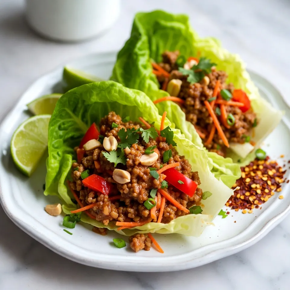 Arrange the lettuce wraps on an attractive platter. Garnish with lime wedges, additional chopped peanuts, fresh cilantro, and a sprinkle of chili flakes for an extra kick.
