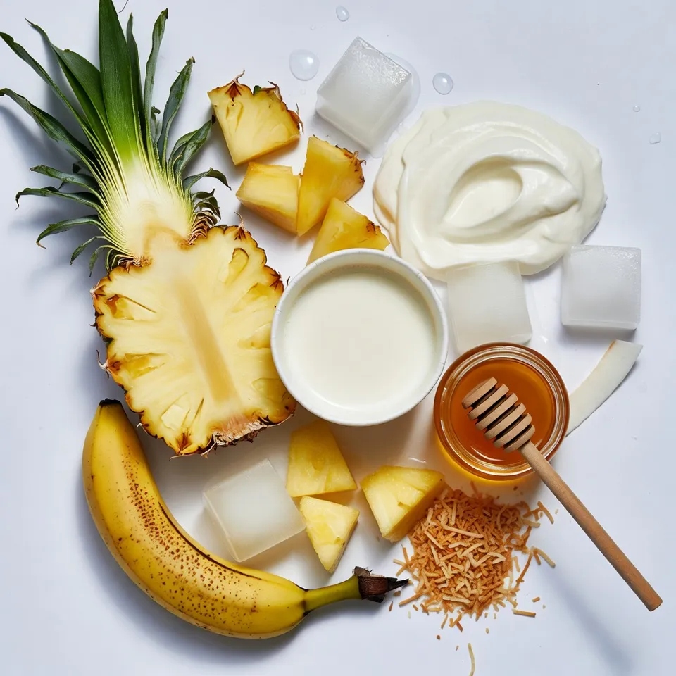 First, gather all your ingredients. You need fresh pineapple chunks, a ripe banana, coconut milk, Greek yogurt, and shredded coconut. If you want extra sweetness, have honey or maple syrup ready. Also, get some ice cubes for that chilly touch. Make sure to cut the pineapple and banana into small pieces for easier blending.
