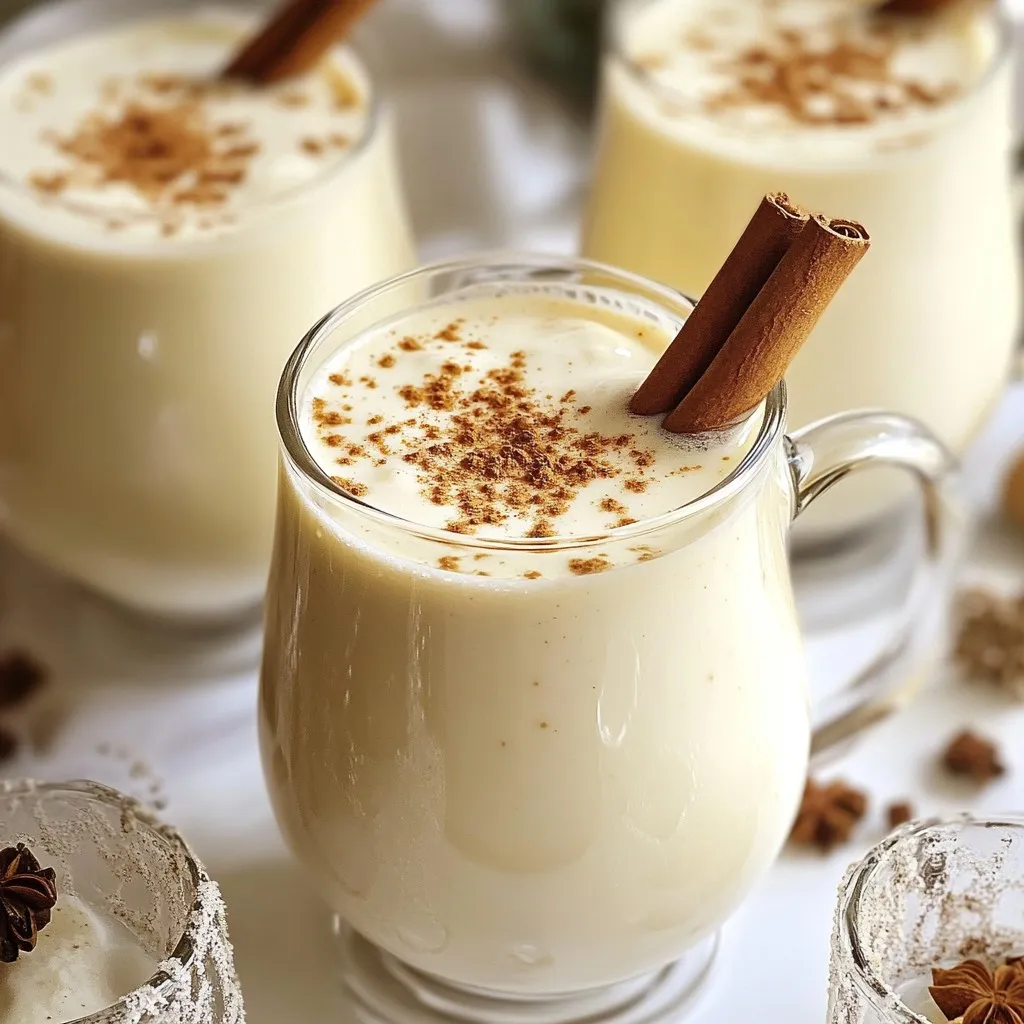 To make a creamy vegan eggnog, you need: - 1 can (400ml) full-fat coconut milk - 1 cup almond milk (or any preferred plant-based milk) - 1/4 cup pure maple syrup - 1 teaspoon vanilla extract - 1 teaspoon ground nutmeg - 1 teaspoon ground cinnamon - 1/4 teaspoon ground cloves - A pinch of sea salt - 1/4 cup raw cashews, soaked You can make your eggnog even prettier with: - Cinnamon sticks - Freshly grated nutmeg If almond milk isn't your favorite, try these: - Soy milk - Oat milk - Cashew milk - Rice milk These choices will give you a tasty base for your drink. Each type of milk adds a unique flavor and texture. {{ingredient_image_2}} Start by soaking the cashews. Use water and let them sit for at least 2 hours. If you can, soak them overnight for best results. Once they are soft, drain and rinse the cashews. This step makes them creamy and smooth in the eggnog. Next, gather your blender and all your ingredients. Add the soaked cashews to the blender. Pour in the full-fat coconut milk and almond milk. Then, add the maple syrup, vanilla extract, ground nutmeg, ground cinnamon, ground cloves, and a pinch of sea salt. Blend on high for 1-2 minutes. You want a smooth and creamy mix. If you like it thicker, add more cashews or less almond milk. Taste it and feel free to adjust the sweetness or spices to your liking. After blending, pour the eggnog into a pitcher. Place it in the fridge for at least 1 hour. This lets all the flavors mix well. When you are ready to serve, pour the eggnog into glasses. For a festive touch, add a cinnamon stick and sprinkle some freshly grated nutmeg on top. Enjoy your creamy vegan eggnog! To achieve the best creaminess in your vegan eggnog, always use a high-speed blender. The power helps blend all ingredients smoothly. Start with the liquid ingredients first, like coconut milk and almond milk. Then add the soaked cashews. This layering helps everything mix well. Blend for 1-2 minutes until smooth. If you need a thicker eggnog, add more soaked cashews. You can also reduce almond milk to get the right texture. Taste your eggnog during blending. You can always add more maple syrup for sweetness. If you want it spicier, add extra nutmeg, cinnamon, or cloves. Remember, everyone has different taste buds. Start with the original amounts, then tweak as needed. You can always add but cannot take away. This way, your eggnog suits your preference perfectly. If you have leftover eggnog, store it in an airtight container. Place it in the fridge for up to 4 days. The flavors get better as it sits! Before serving, give it a good shake or stir. It may separate slightly, which is normal. You can also freeze it for longer storage. Just make sure to leave some space in the container for expansion. Pro Tips Soak Cashews Properly: Make sure to soak the cashews for at least 2 hours to achieve that ultra-creamy texture. For best results, soak them overnight. Adjust Sweetness: Taste your eggnog before chilling and tweak the sweetness by adding more maple syrup if you prefer a sweeter flavor profile. Chill for Flavor: Allow the eggnog to chill in the refrigerator for at least an hour. This helps the flavors meld together for a more delicious drink. Experiment with Spices: Feel free to adjust the spices to your liking. Adding a bit more nutmeg or cinnamon can enhance the festive flavor of your eggnog. {{image_4}} You can add fun flavors to your vegan eggnog. Try adding pumpkin spice for a fall twist. For a winter vibe, infuse it with peppermint extract. You can also mix in some vanilla bean for a richer taste. Each addition brings a new layer to your drink. Experimenting with flavors can make your eggnog stand out. Vegan eggnog can be enjoyed with or without alcohol. For a festive touch, add a splash of rum or bourbon. This warms up the drink and gives it a holiday feel. If you prefer a non-alcoholic version, skip the spirits. The creamy base and spices still make it festive and delightful. Both options are sure to please your guests. If you have nut allergies, there are easy swaps. Use oat milk or rice milk instead of almond milk. For the cashews, try sunflower seeds. Soak and blend them just like cashews. This keeps your eggnog creamy without nuts. Always check labels to make sure your ingredients are safe. With these substitutions, everyone can enjoy this creamy drink. Vegan eggnog has many health benefits. It uses plant-based milk, which is lower in calories than dairy milk. Coconut milk adds healthy fats, giving you energy. Cashews provide protein and vitamins. Maple syrup is a natural sweetener. This drink is free from cholesterol and lactose, making it good for many diets. Choosing vegan eggnog helps the planet. Plant-based ingredients need less water and land than dairy. This drink has a smaller carbon footprint. When you choose vegan options, you support animal welfare. By picking vegan eggnog, you make a choice for a better world. Traditional eggnog uses eggs and cream, which can be heavy. Vegan eggnog tastes just as rich and creamy. It offers similar flavors without the animal products. You can enjoy the festive taste while being kind to your body and the planet. Vegan eggnog is lighter and easier to digest, making it a great choice for everyone. Yes, you can make Vegan Eggnog ahead of time. It tastes even better after resting. I suggest making it a day before your gathering. This gives the flavors time to blend. Just store it in the fridge until you are ready to serve. Vegan Eggnog lasts about 4 to 5 days in the fridge. Make sure to store it in an airtight container. If you notice any separation, just shake or stir it well before serving. If you want a nut-free option, use silken tofu. It adds creaminess without nuts. You can also try sunflower seeds, soaked and blended. They give a rich texture too. Another choice is coconut cream, which gives a nice thickness. Vegan eggnog is a great treat for everyone. We explored essential ingredients and optional garnishes. You learned h