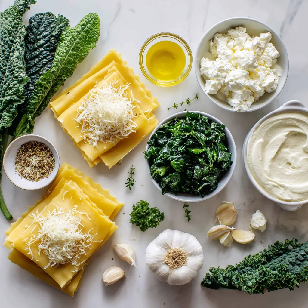 Each ingredient plays a key role in the dish. The lasagna noodles serve as the base and hold everything together. Ricotta adds creaminess and a rich texture. Mozzarella melts beautifully and provides a gooey layer of cheesy goodness. Parmesan offers a sharp taste that enhances the overall flavor. Spinach and kale bring vibrant color and nutrients. Garlic adds a fragrant punch, while olive oil enriches the dish. Nutmeg adds warmth, and salt and pepper enhance all flavors.